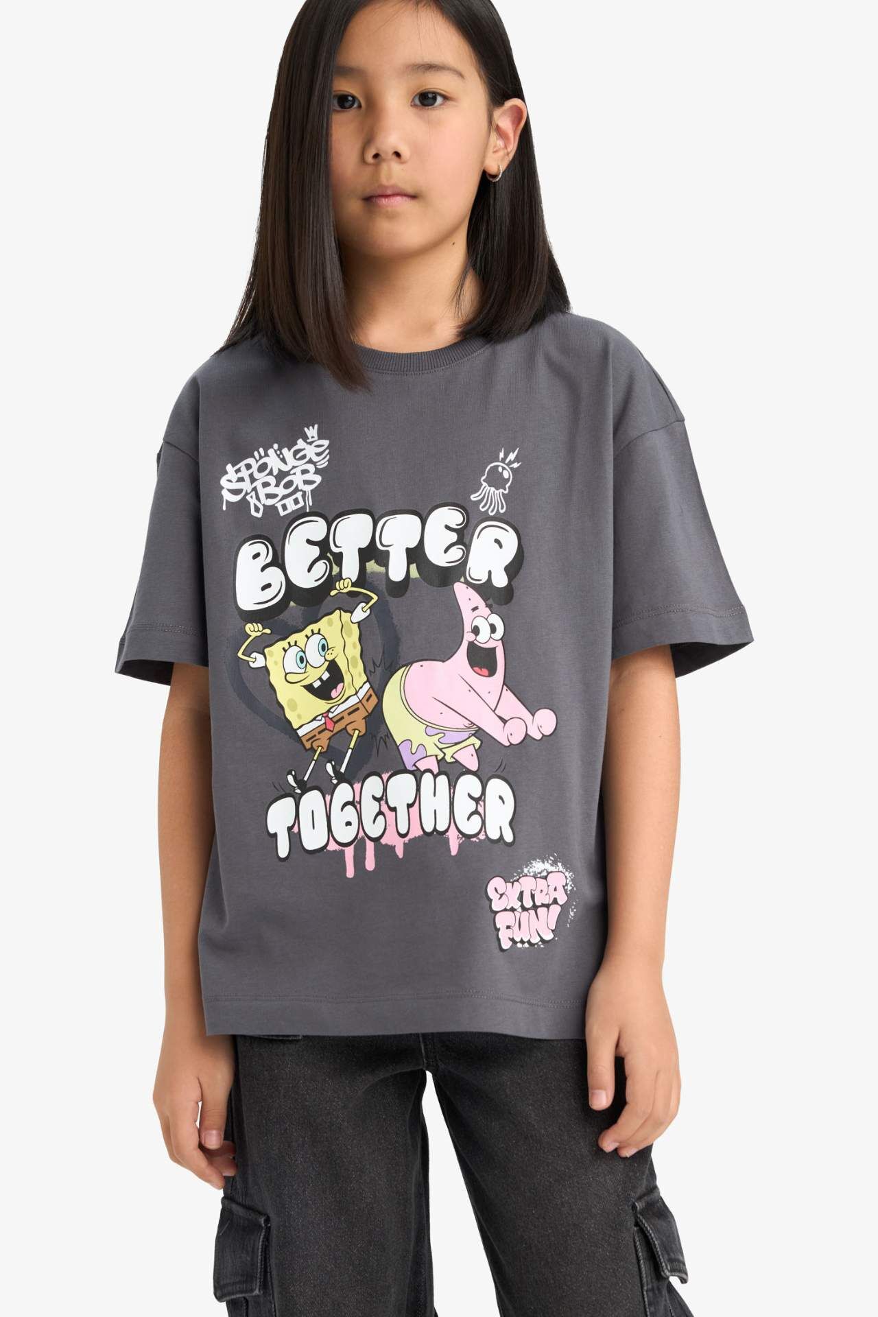 DeFacto Kız Çocuk SpongeBob Oversize Geniş Kalıp Bisiklet Yaka Kısa Kollu Tişört E6565A825HSAR148