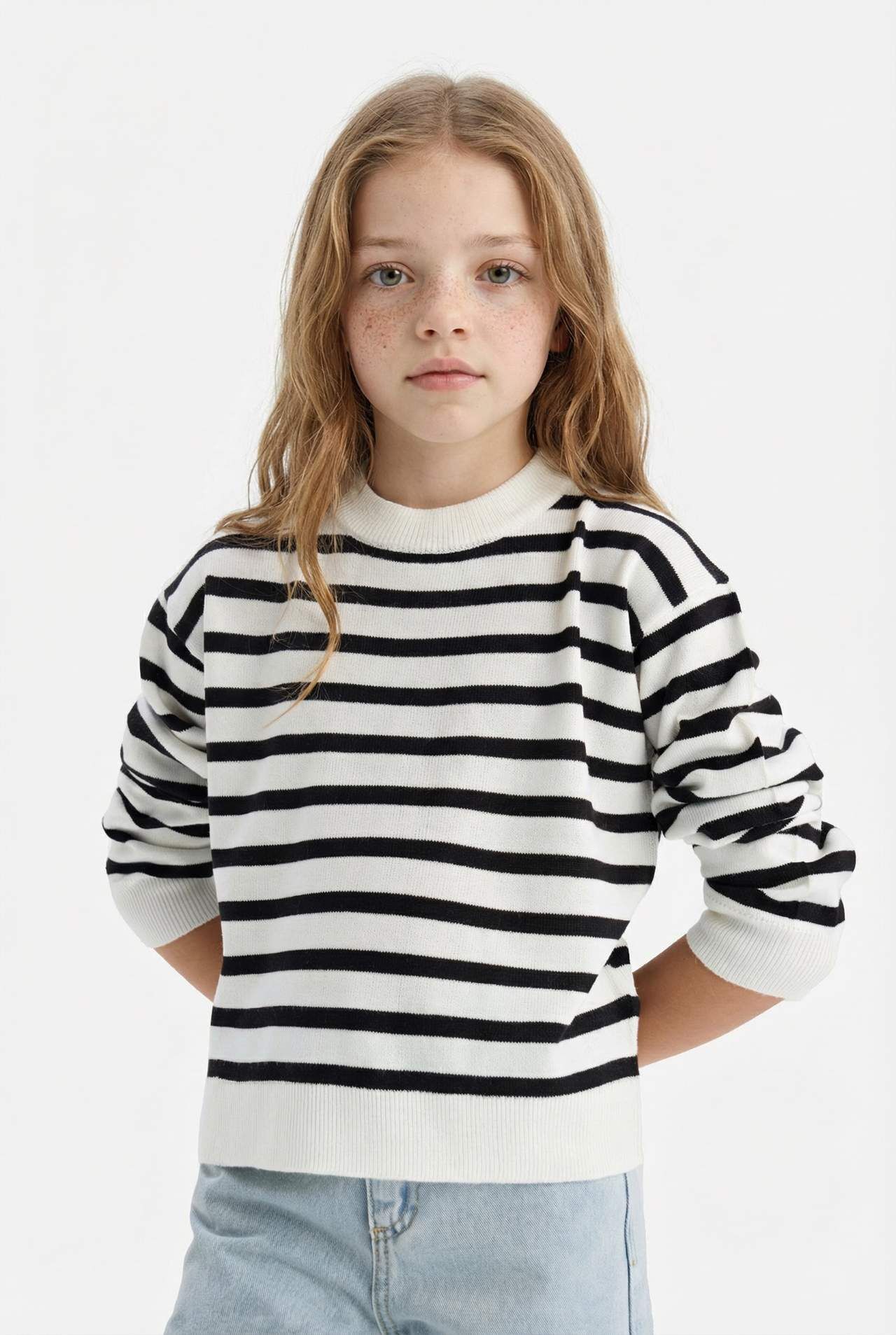 Kız Çocuk Standart Fit Bisiklet Yaka Çizgili Triko Kazak