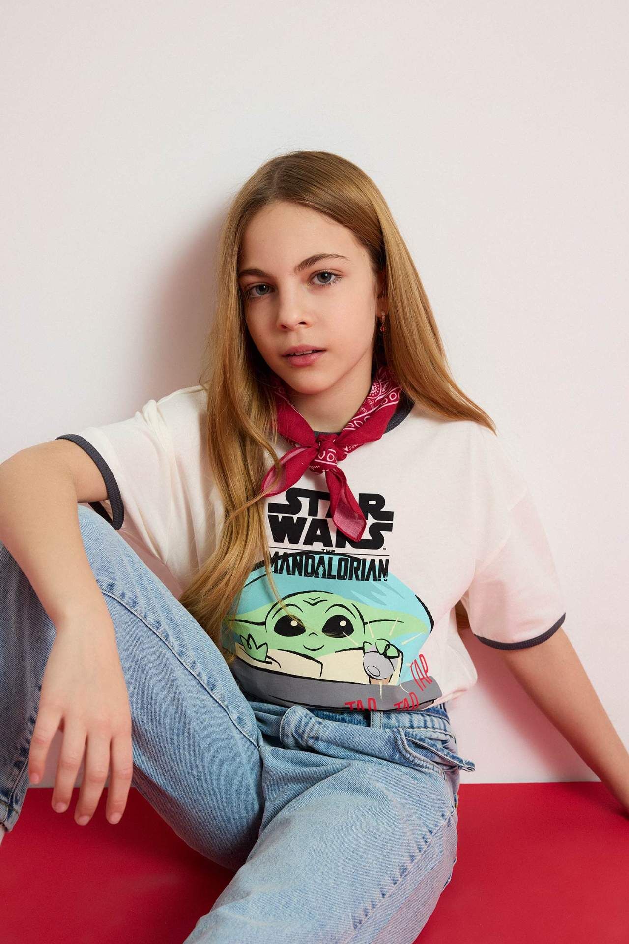 DeFacto Kız Çocuk Star Wars-Mandalorian Relax Fit Bisiklet Yaka Ribana Kısa Kollu Tişört