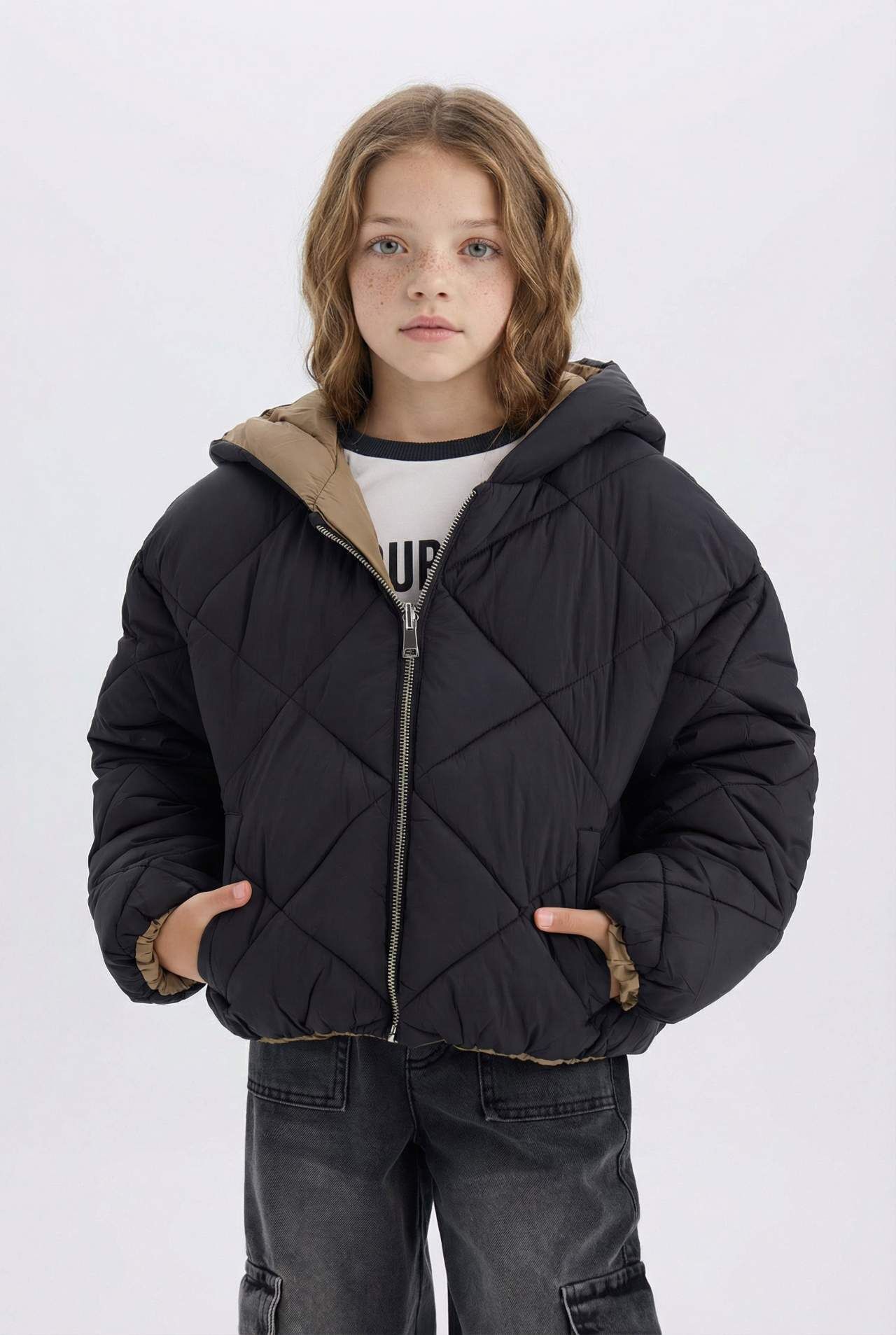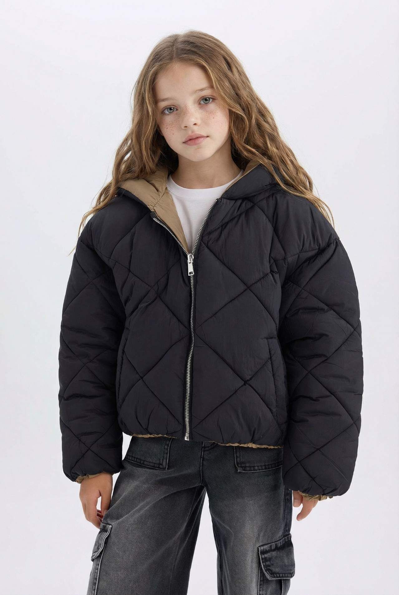 DeFacto Kız Çocuk Su İtici Çift Taraflı Kapüşonlu Kapitoneli Fermuar Kapamalı Cepli Şişme Mont