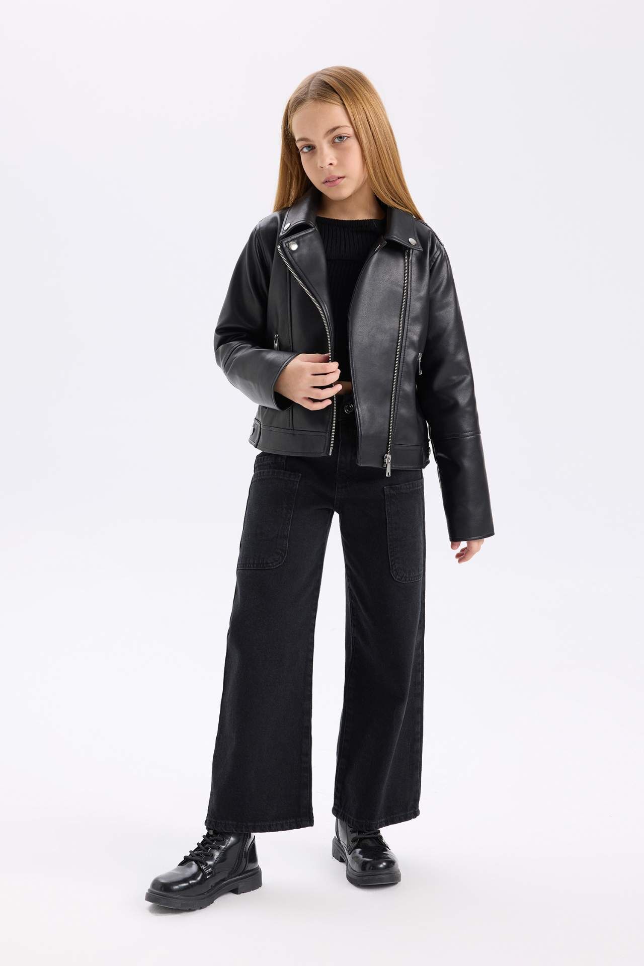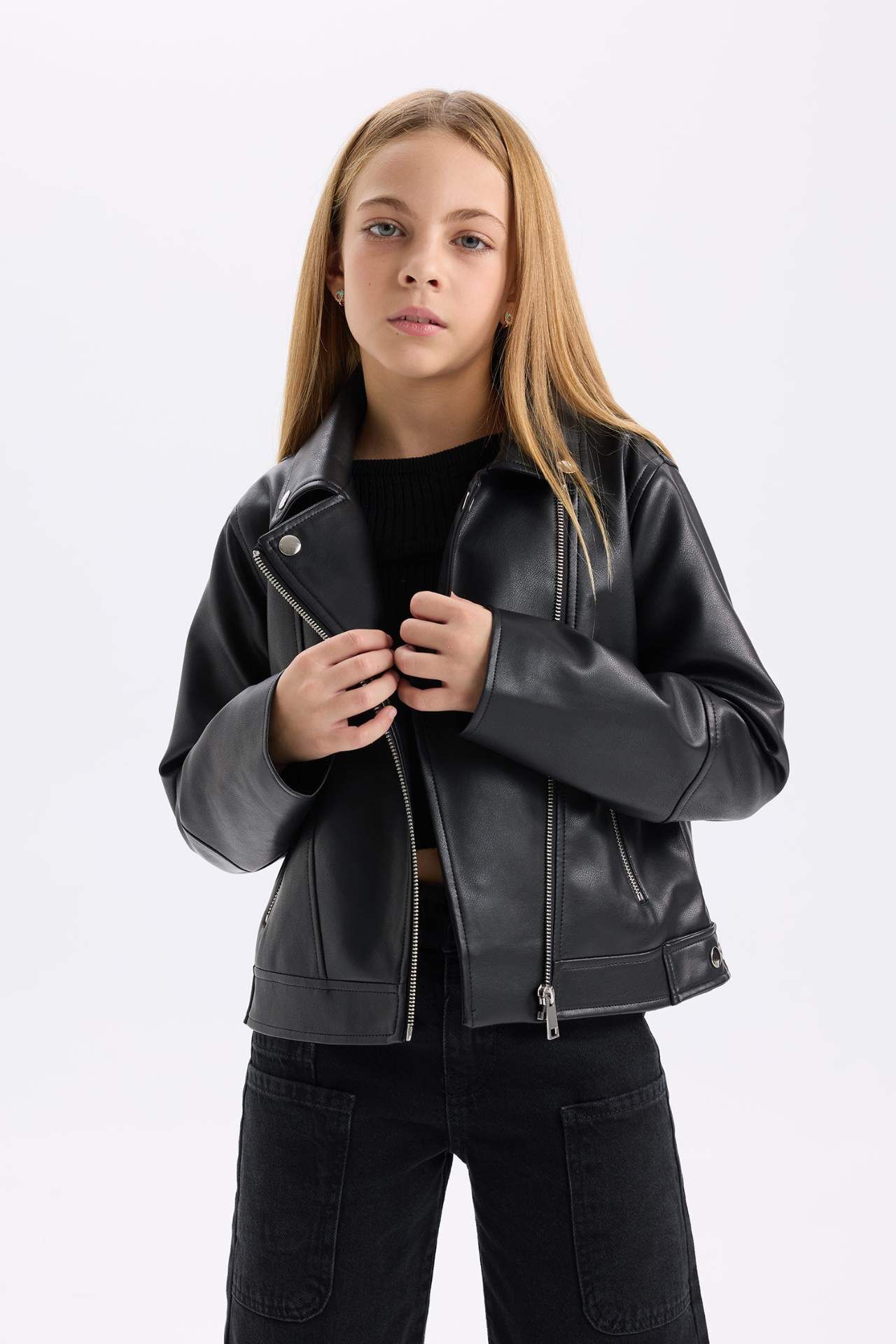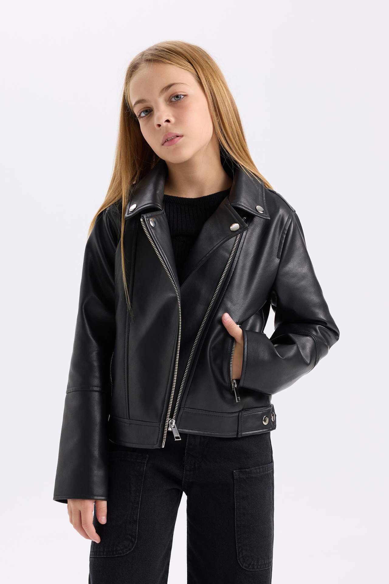 DeFacto Kız Çocuk Su İtici Fermuarlı Suni Deri Ceket Mont