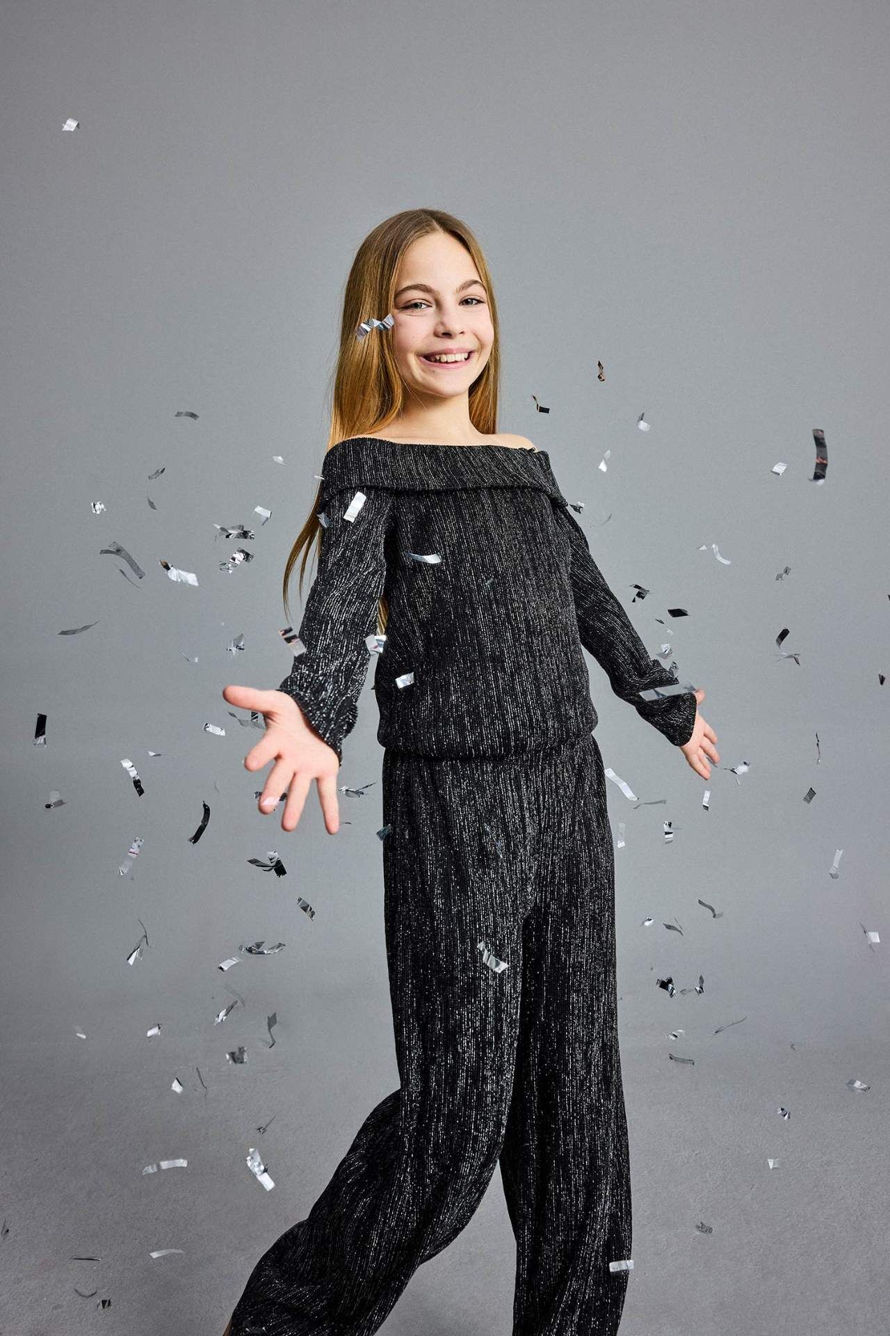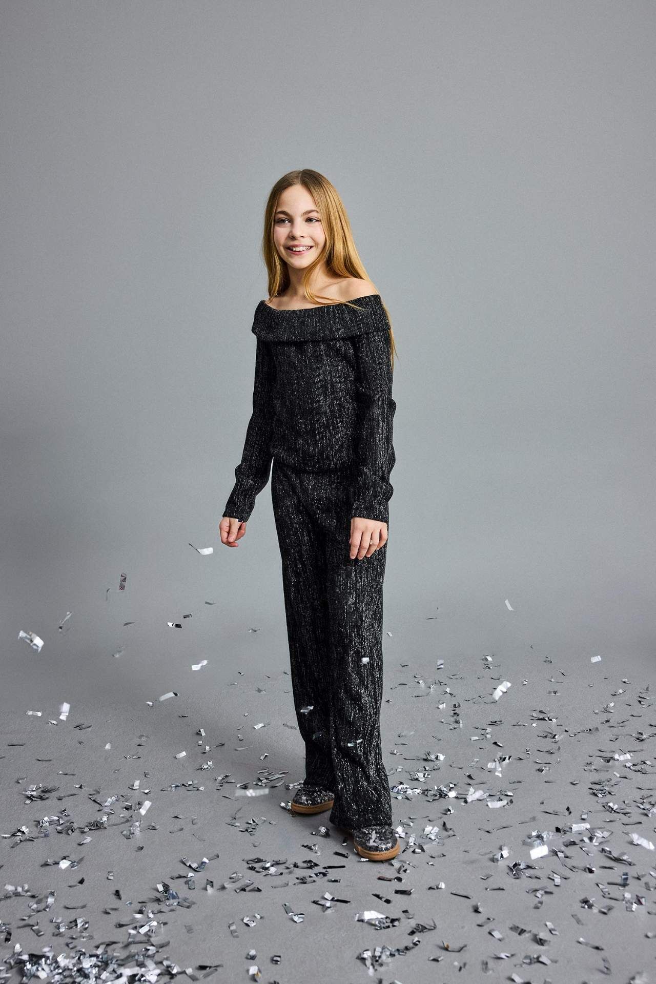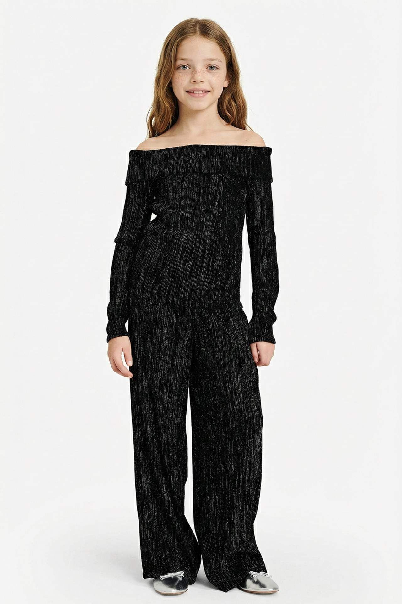 Kız Çocuk Yılbaşı Temalı 2'li Takım Simli Kumaş Omzu Açık Bluz Pantolon