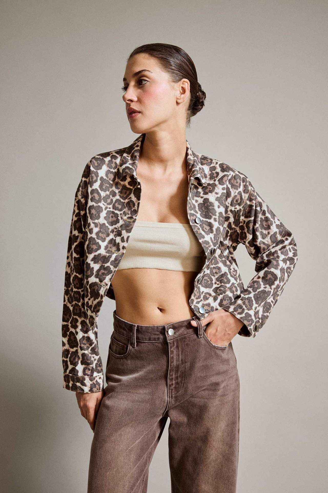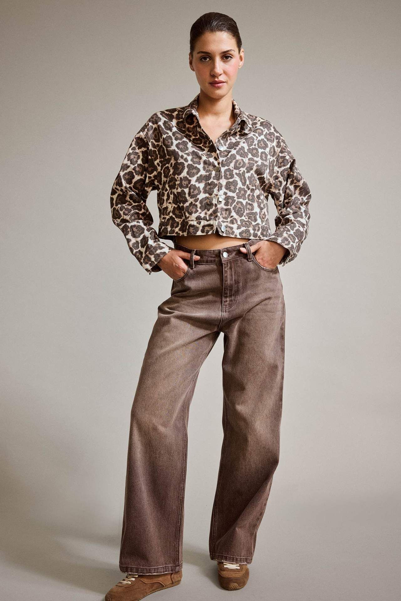 Cesur leopar deseniyle dikkat çeken düğmeli jean ceket, klasik kesime modern bir yorum katıyor. Katmanlı stiller için ideal olan bu parça, kombinleriniz için güçlü bir parça. Pamuk 100%,Pamuk 100%,Pamuk 100%,Pamuk 100%,Pamuk 100%,Pamuk 100%,Pamuk 100% Manken Bedeni: Göğüs: 81 Boy: 1,76 Basen: 90 Bel: 64
