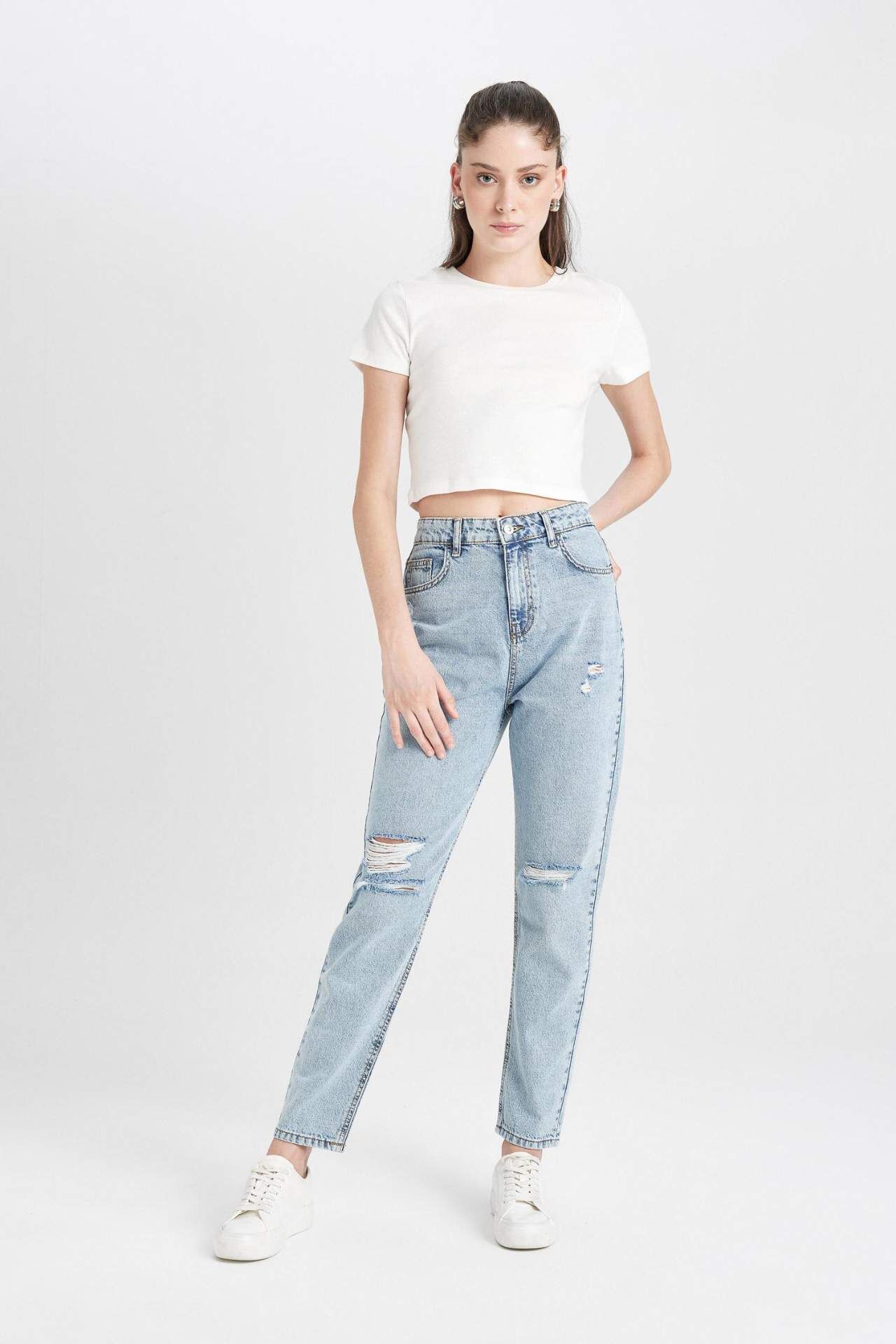 DeFacto Lina Mom Fit Yırtık Detaylı Yüksek Bel Bilek Boy Jean Yıkamalı Pantolon