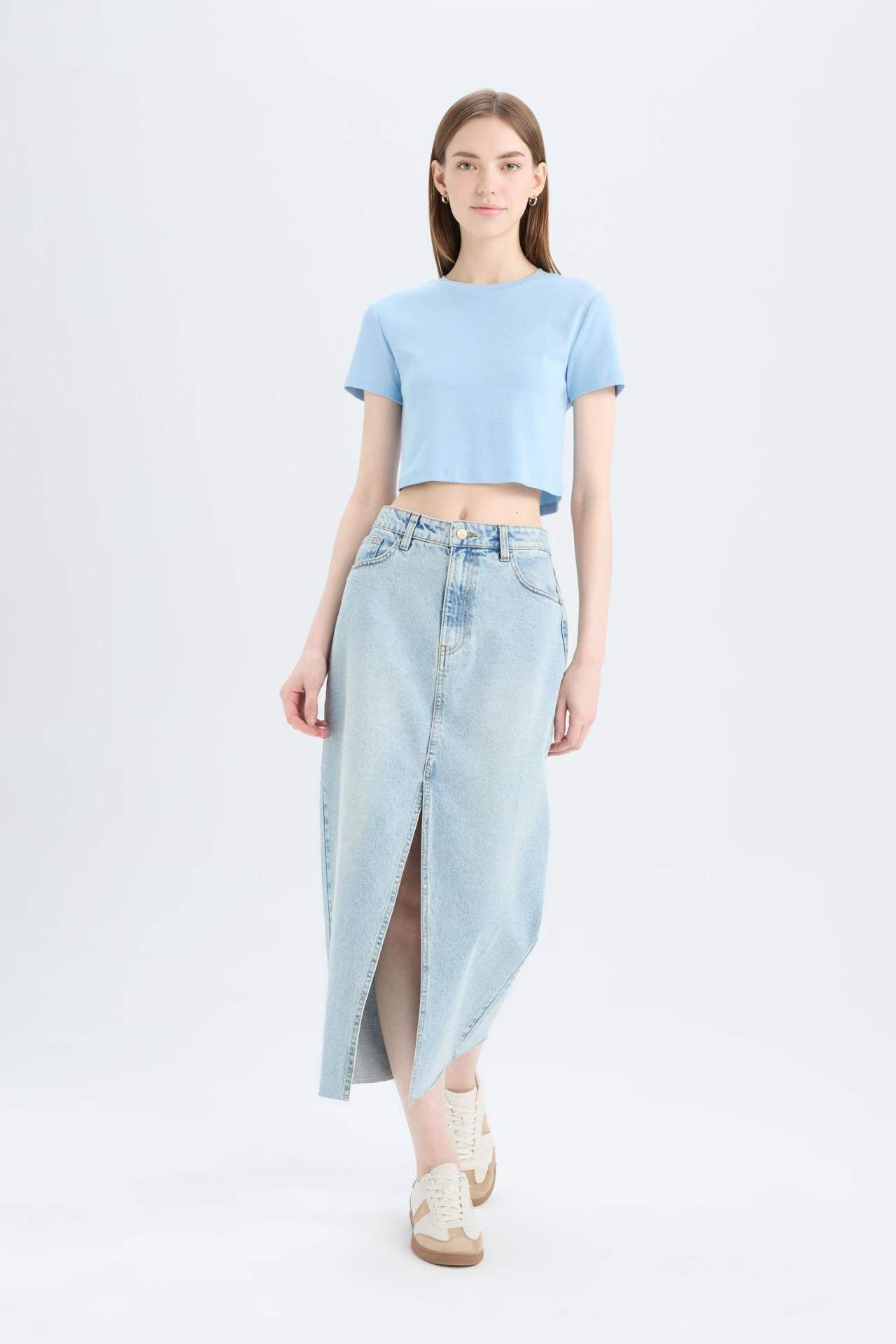 Uzun ve rahat kesimiyle şıklık sunan bu midi jean etek, klasik denim dokusuyla her tarza kolayca uyum sağlar. Günlük ve özel kombinlerde stilinizi tamamlayan zamansız bir parça. Pamuk 100%,Pamuk 100%,Pamuk 100%,Pamuk 100%,Pamuk 100%,Pamuk 100% Manken Bedeni: Göğüs: 80 Boy: 1,74 Basen: 91 Bel: 61