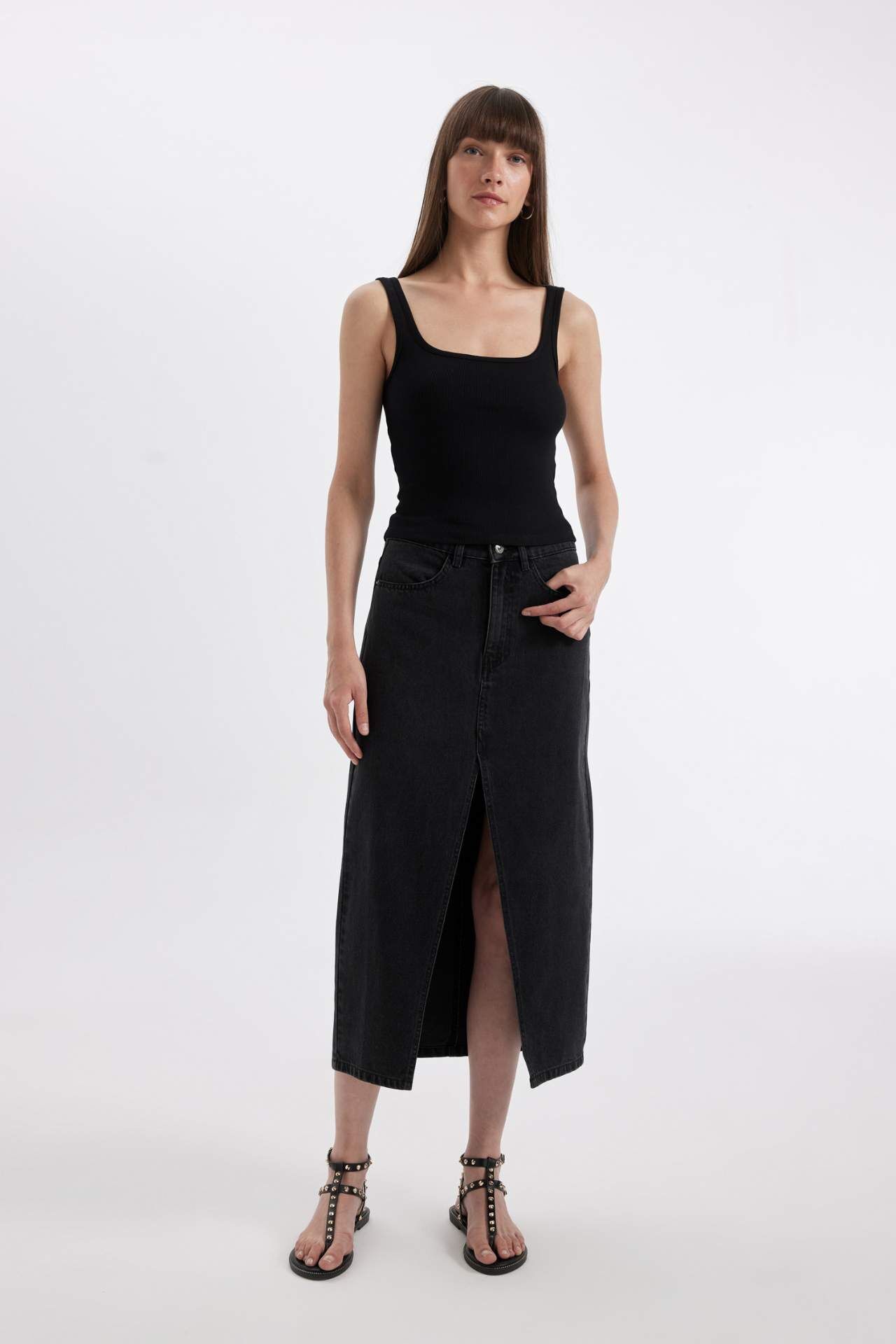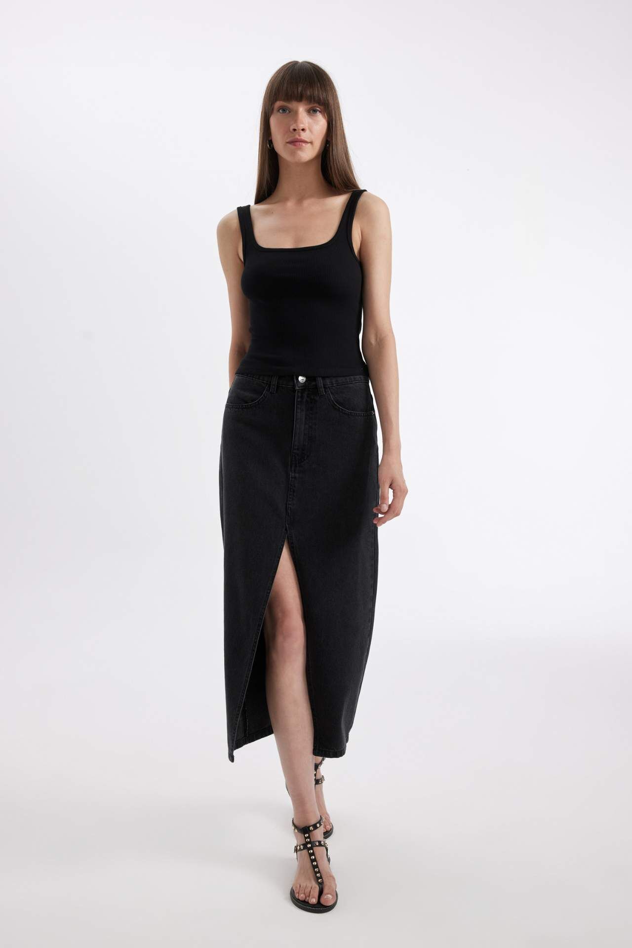 DeFacto Long Fit Yırtmaçlı Jean Midi Etek