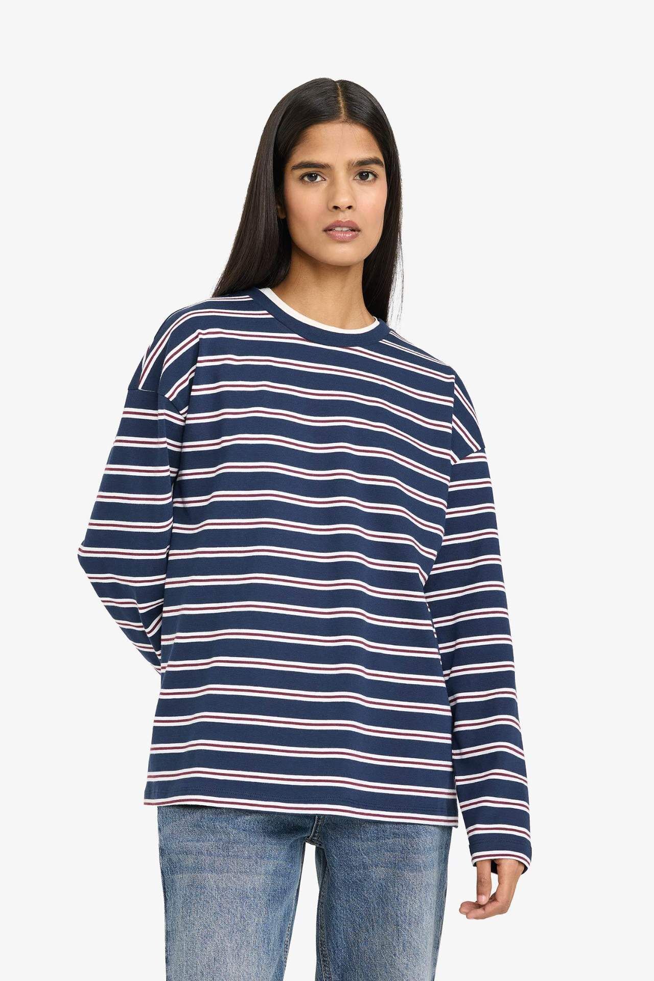 Loose fit bisiklet yaka çizgili sweatshirt, rahat kesimi ve zamansız çizgili tasarımıyla günlük stilinize konfor katar. Yumuşak dokusu sayesinde gün boyu keyifli bir kullanım sunar. Pamuk 100%
