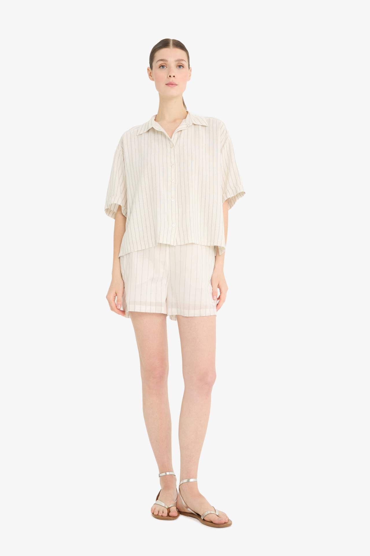 DeFacto Loose Fit Gömlek Yaka Çizgili Keten Karışımlı Kısa Kollu Gömlek