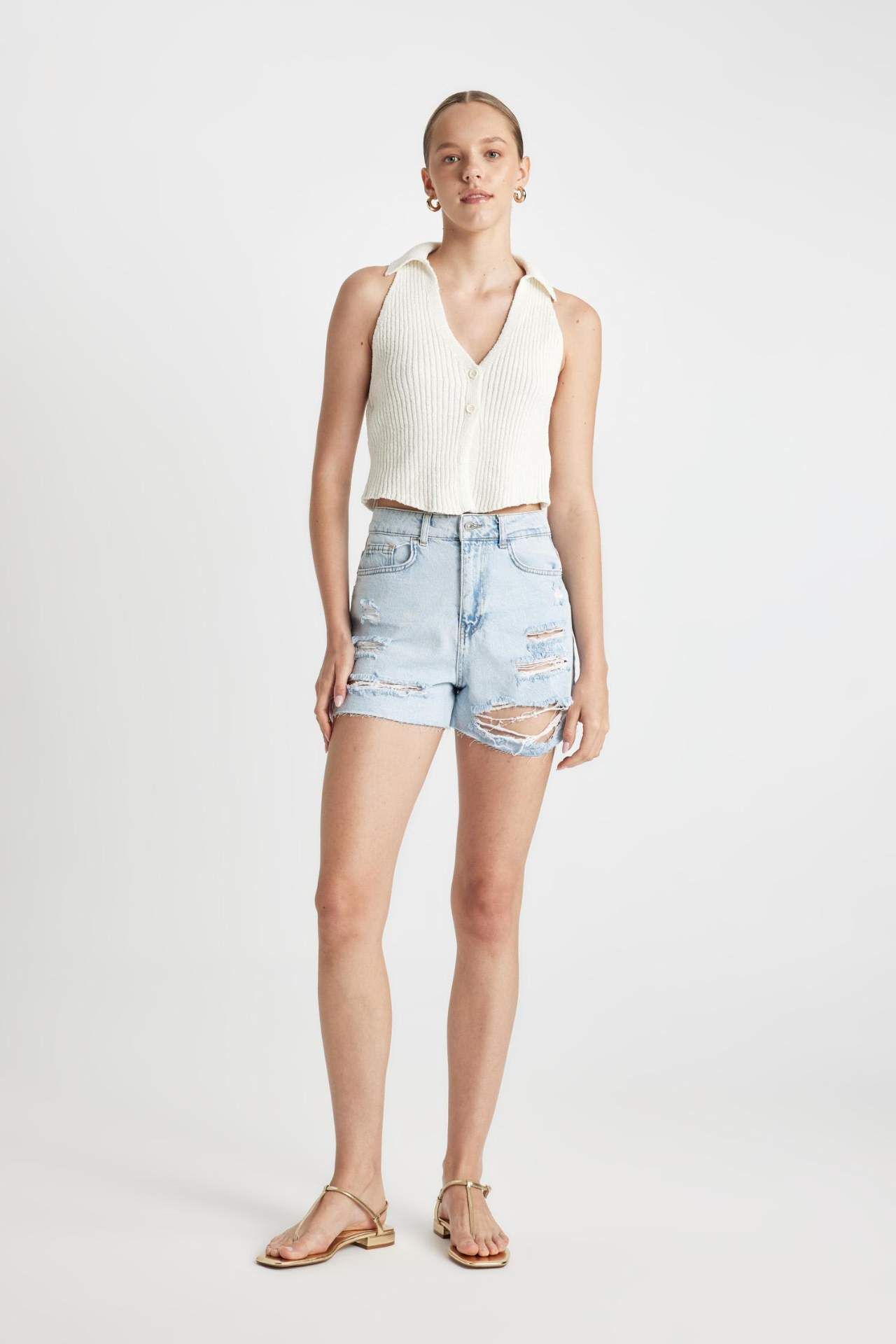DeFacto Mom Fit Yüksek Bel Paça Ucu Kesik Jean Şort C0680AX24HSNM39