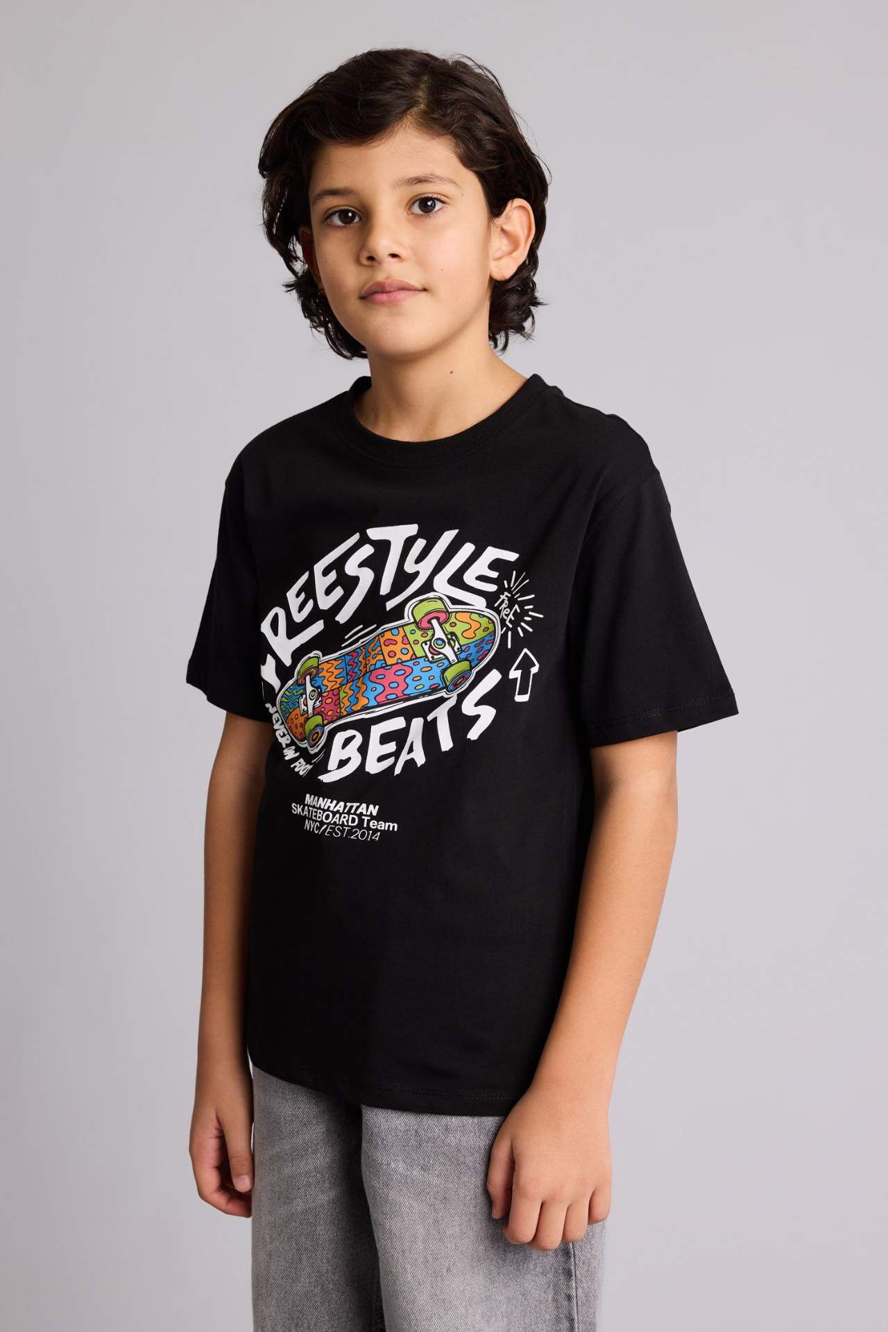 New Regular Fıt Bisiklet Yaka Baskılı Kısa Kollu Tişört Erkek Çocuk