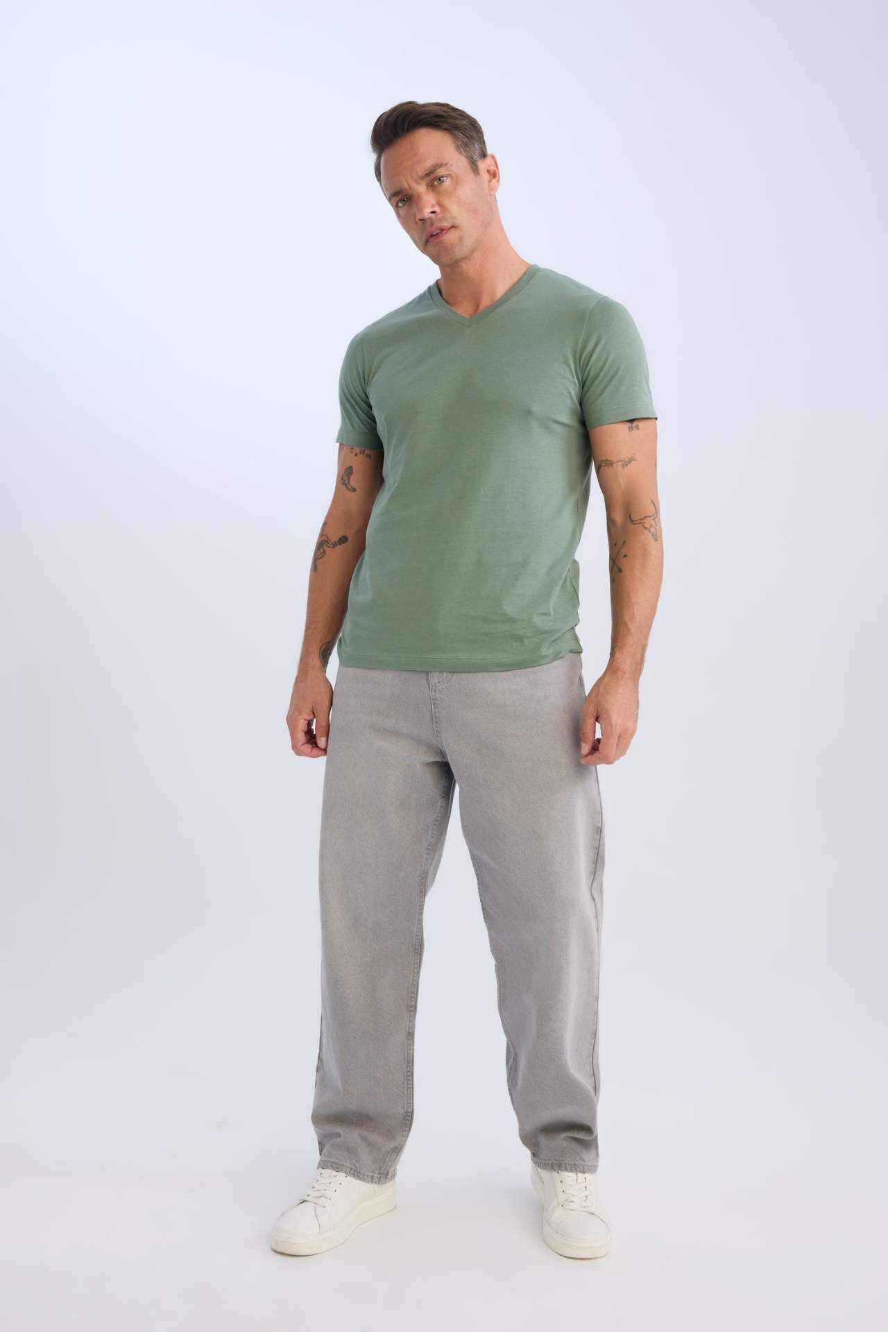 New Regular Fit V Yaka Basic Düz Kısa Kollu Tişört, sade ve şık bir tasarıma sahip. V yaka kesimiyle modern bir görünüm sunar, regular fit yapısı ise rahat bir kullanım sağlar. Her türlü kombinle uyumlu olup, hem günlük hem de hafif şık kombinlerde rahatlıkla tercih edilebilir. Pamuk 100%,Pamuk 100%,Pamuk 100%,Pamuk 100%,Pamuk 100%,Pamuk 100% Manken Bedeni: Göğüs: 100 Boy: 1,89 Basen: 97 Bel: 81