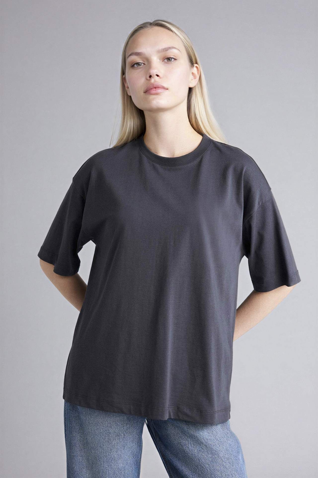 Oversıze Bisiklet Yaka Basıc Düz Penye Kısa Kollu Tişört