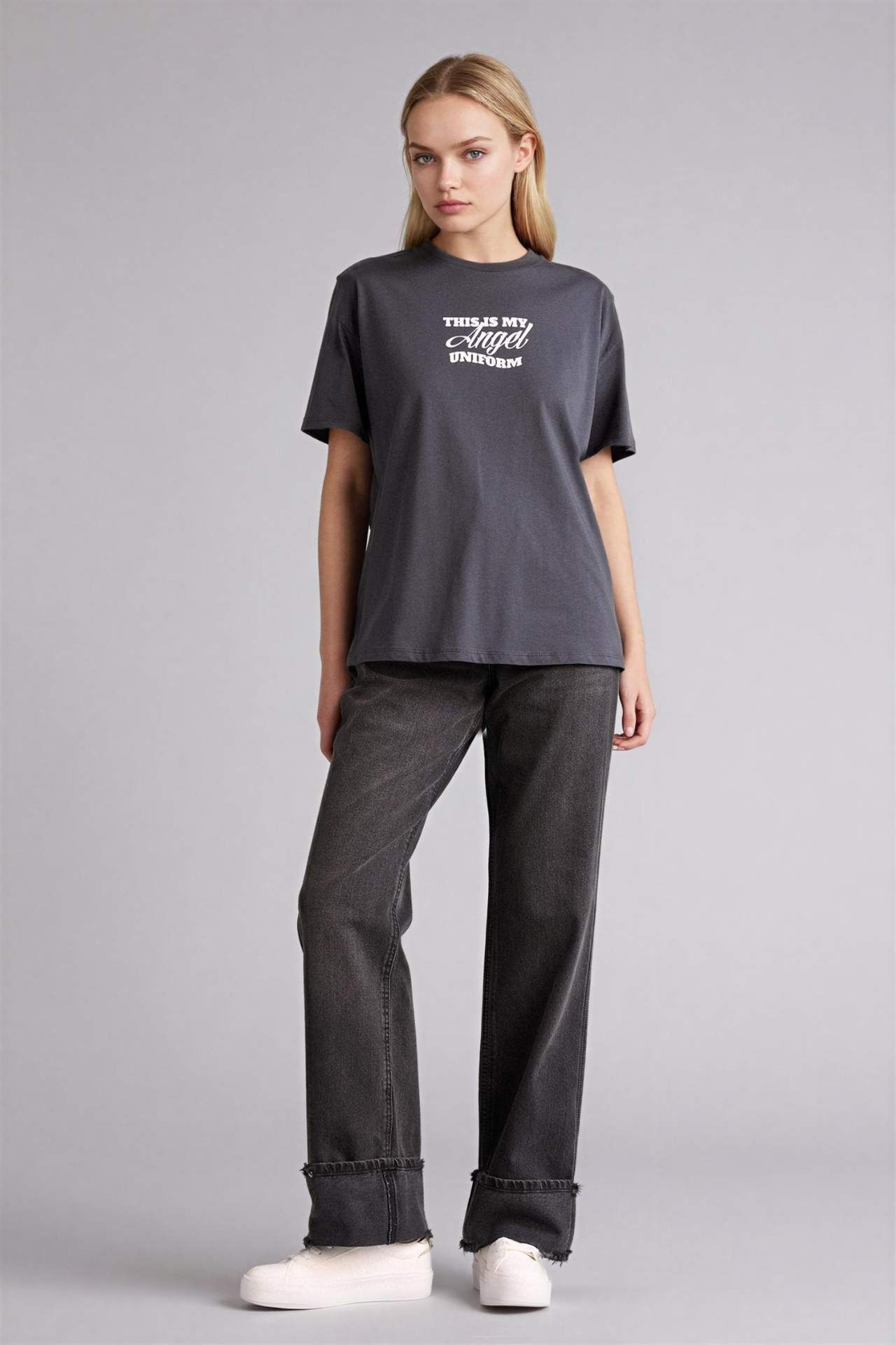 DeFacto Oversıze Bisiklet Yaka Baskılı Kısa Kollu Tişört