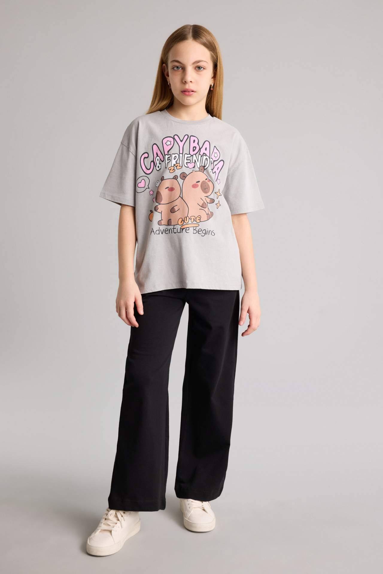DeFacto Oversıze Bisiklet Yaka Hayvan Desenli Kısa Kollu Tişört Kız Çocuk