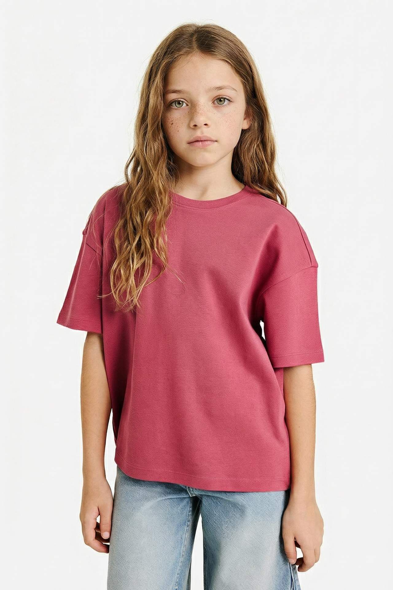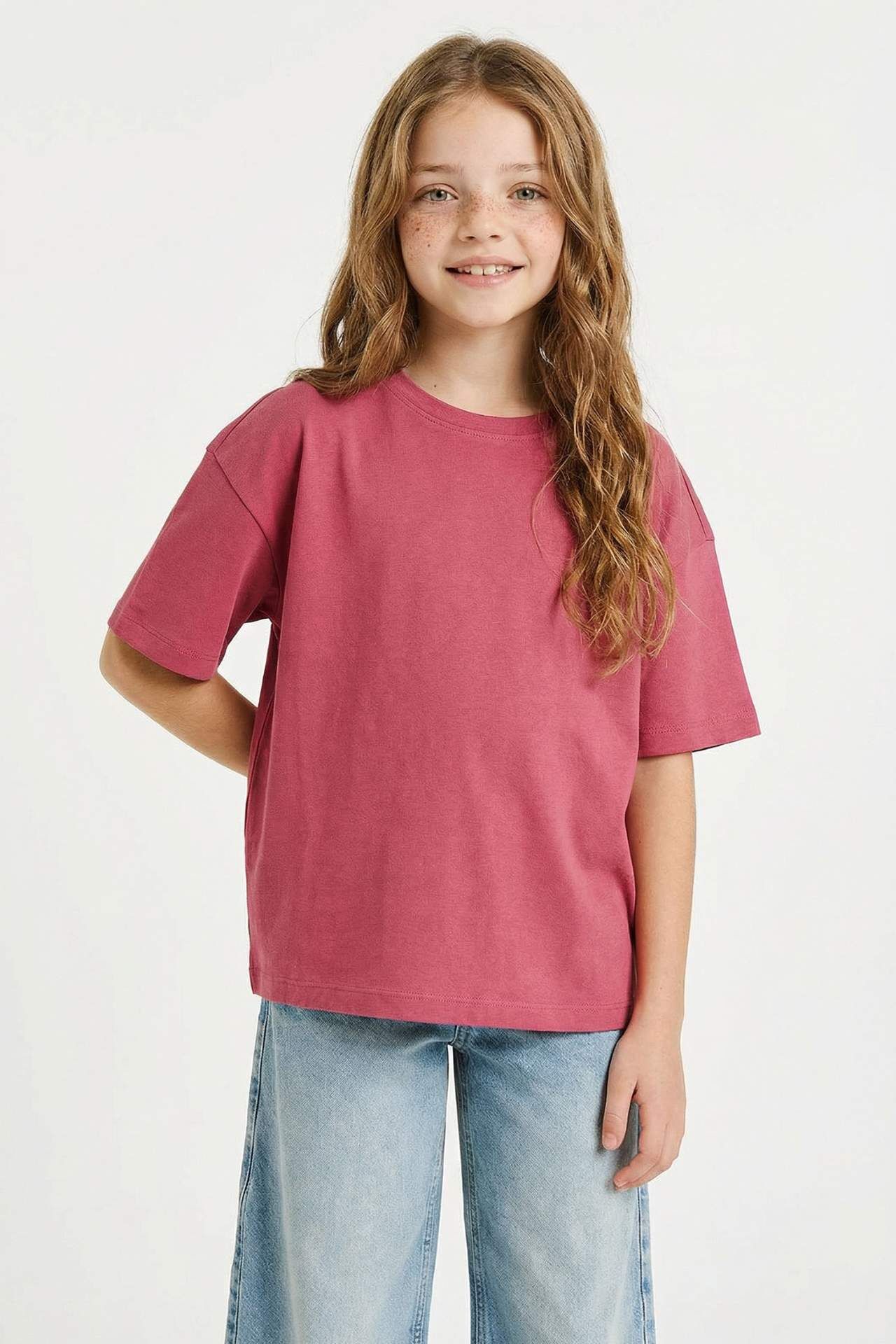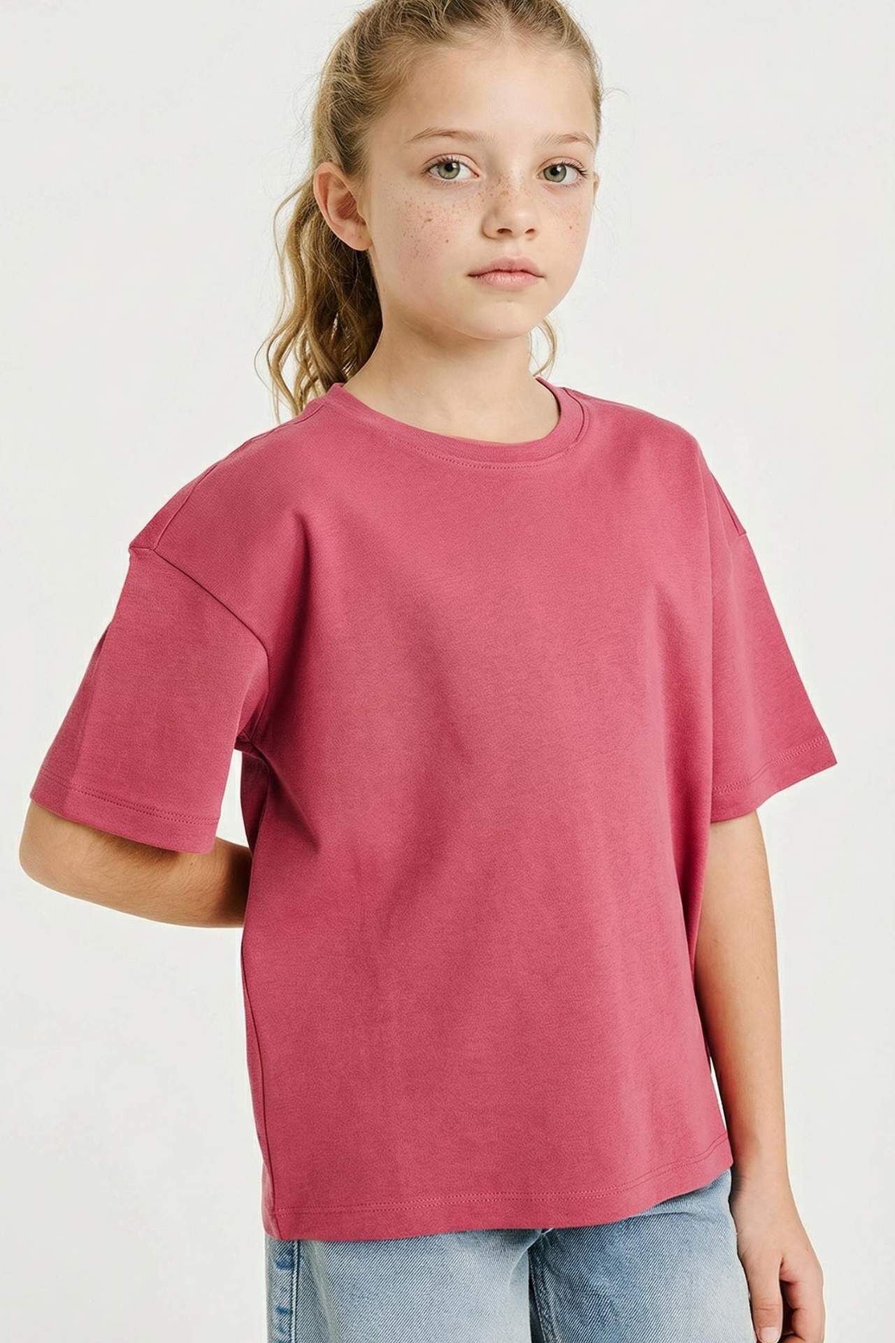 Oversıze Bisiklet Yaka Kısa Kollu Tişört Kız Çocuk