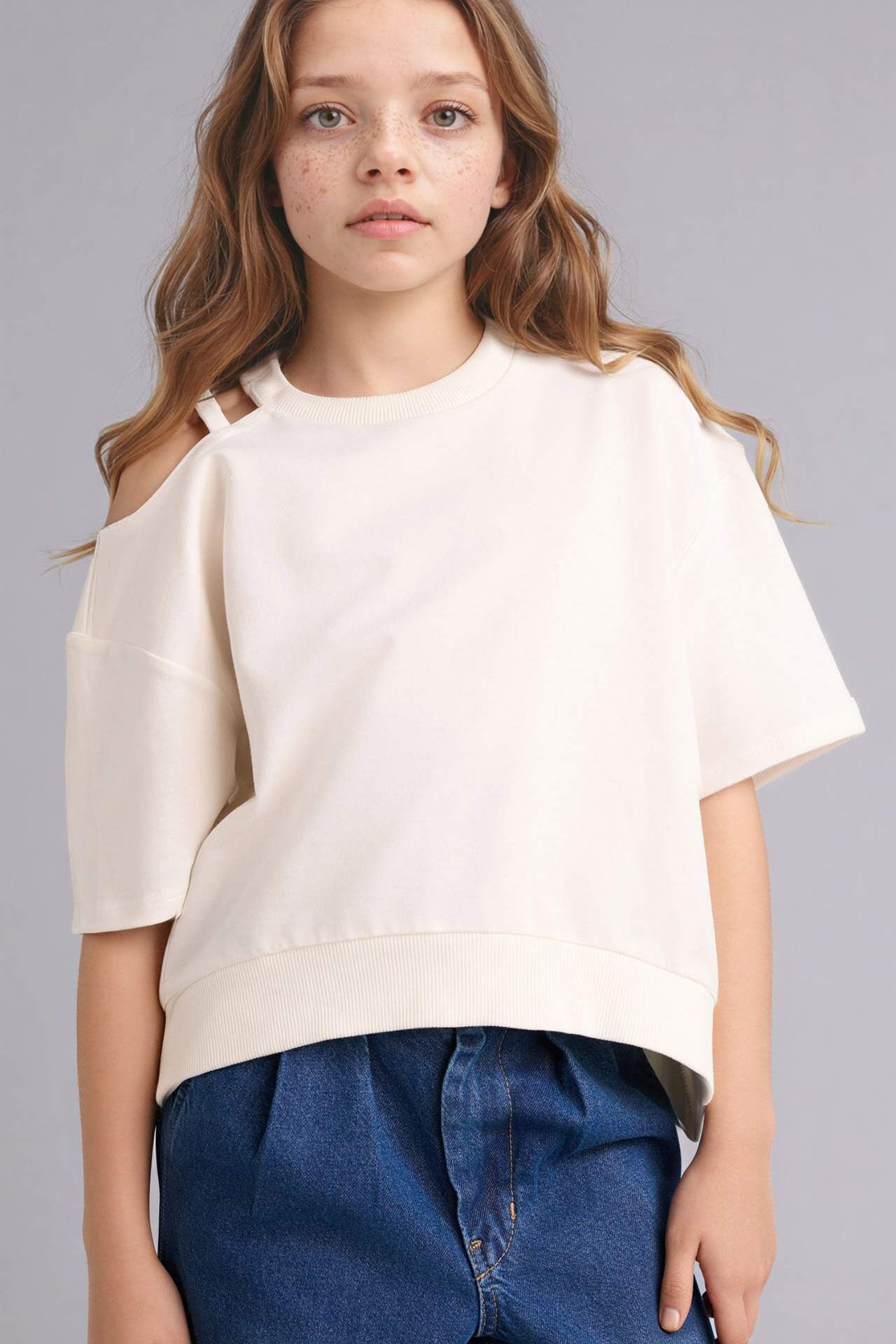 Oversıze Bisiklet Yaka Sweatshirt Kumaşı Kısa Kollu Tişört Kız Çocuk