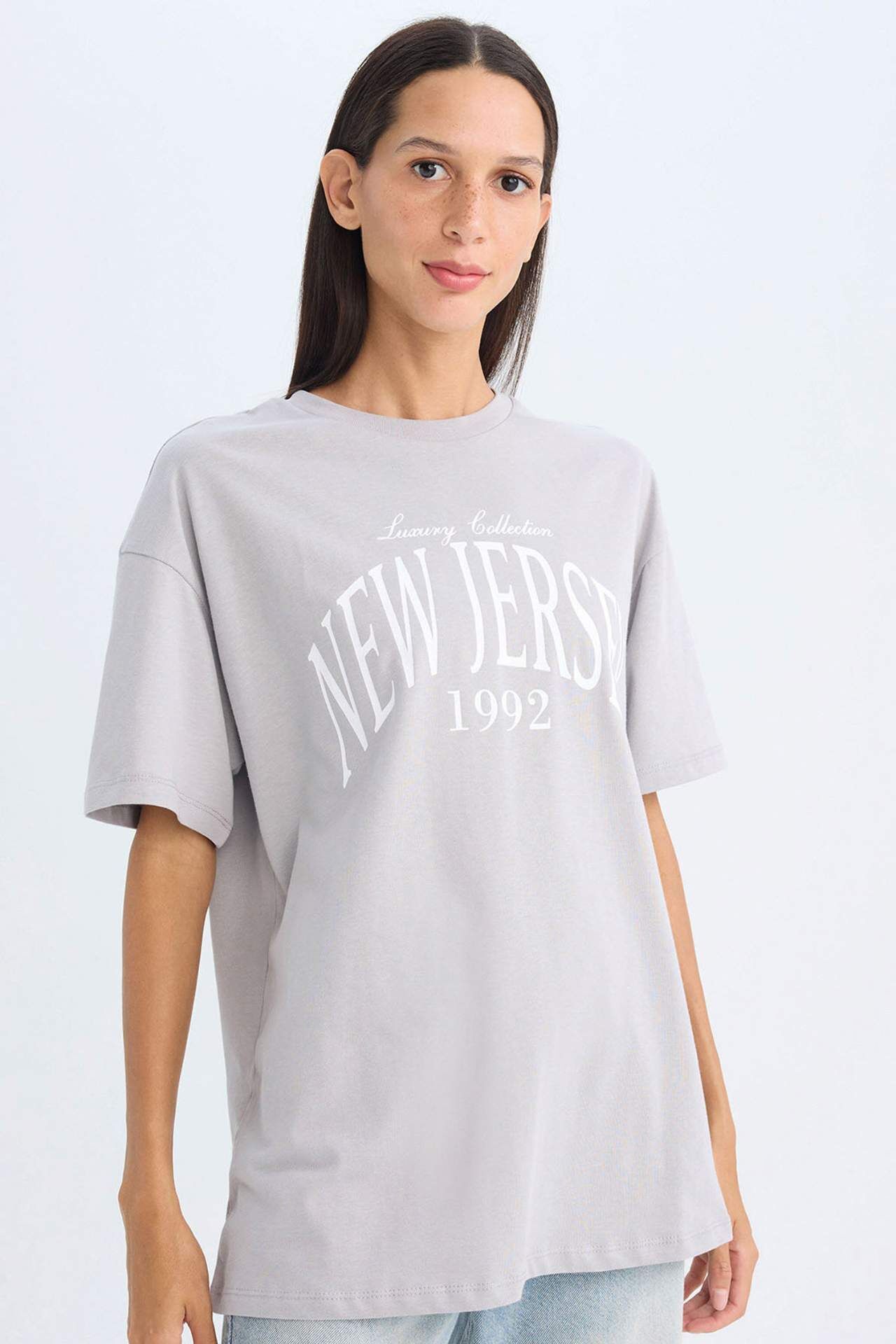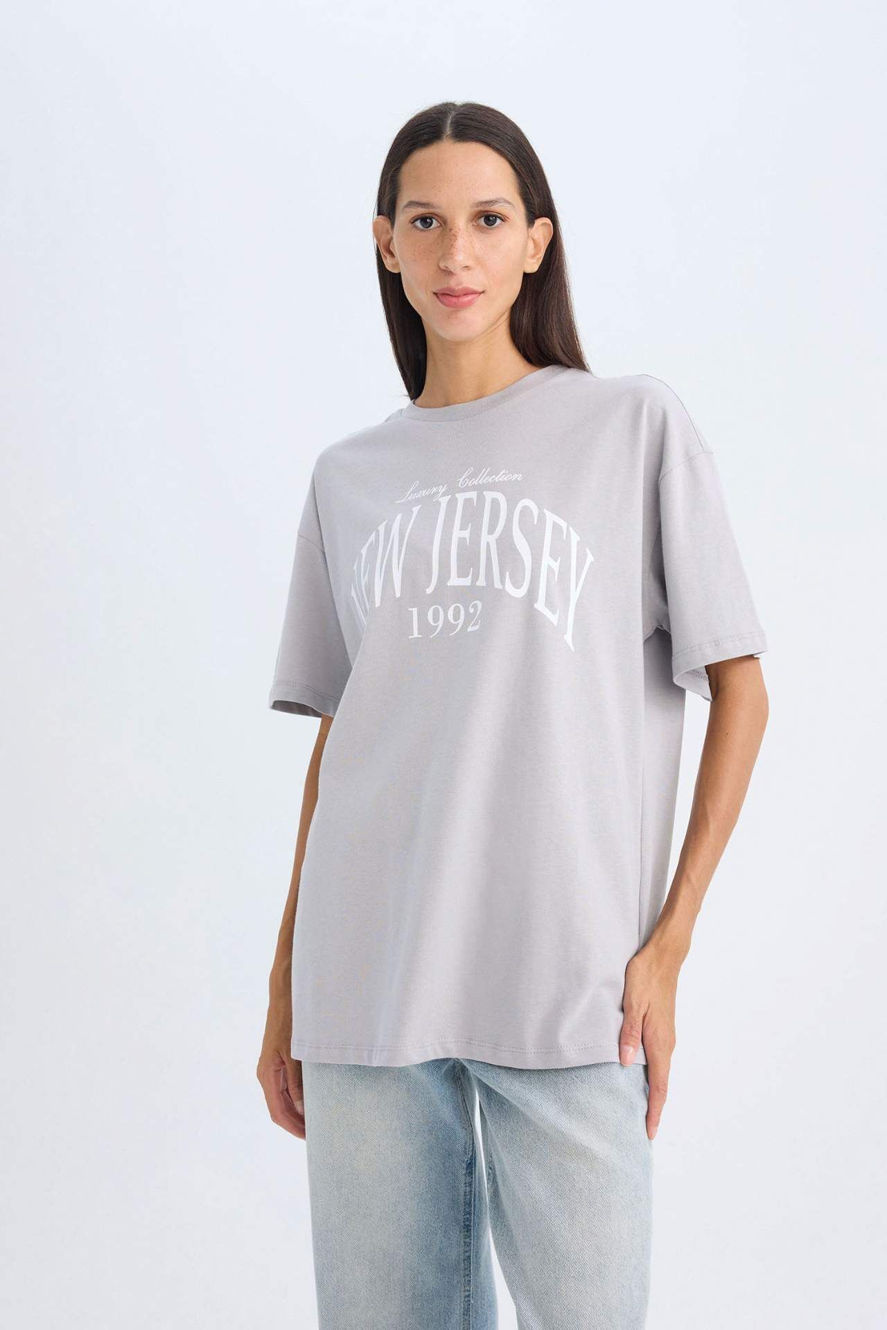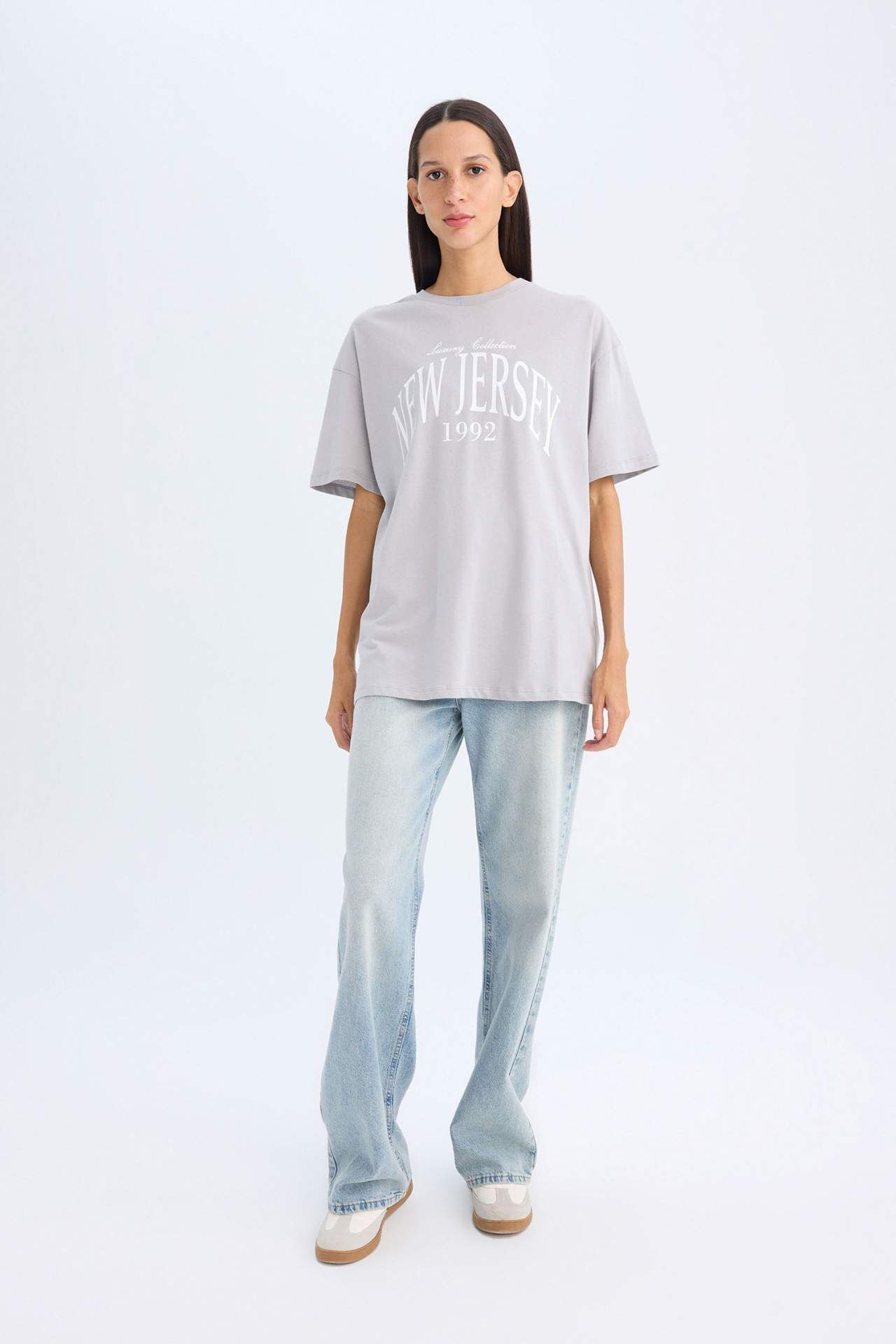 Oversize Fit Bisiklet Yaka Baskılı Kısa Kollu Tişört