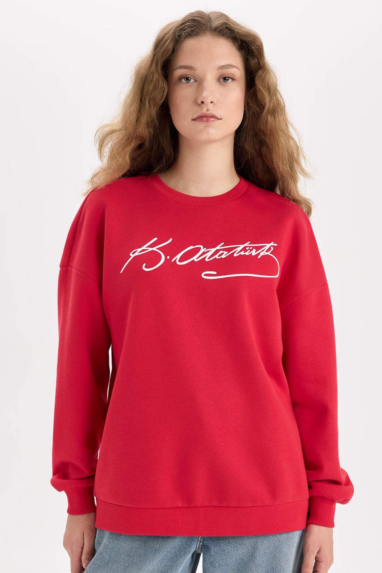 DeFacto Oversize Fit Geniş Kalıp Atatürk İmzalı Bisiklet Yaka Kalın Kumaş Sweatshirt
