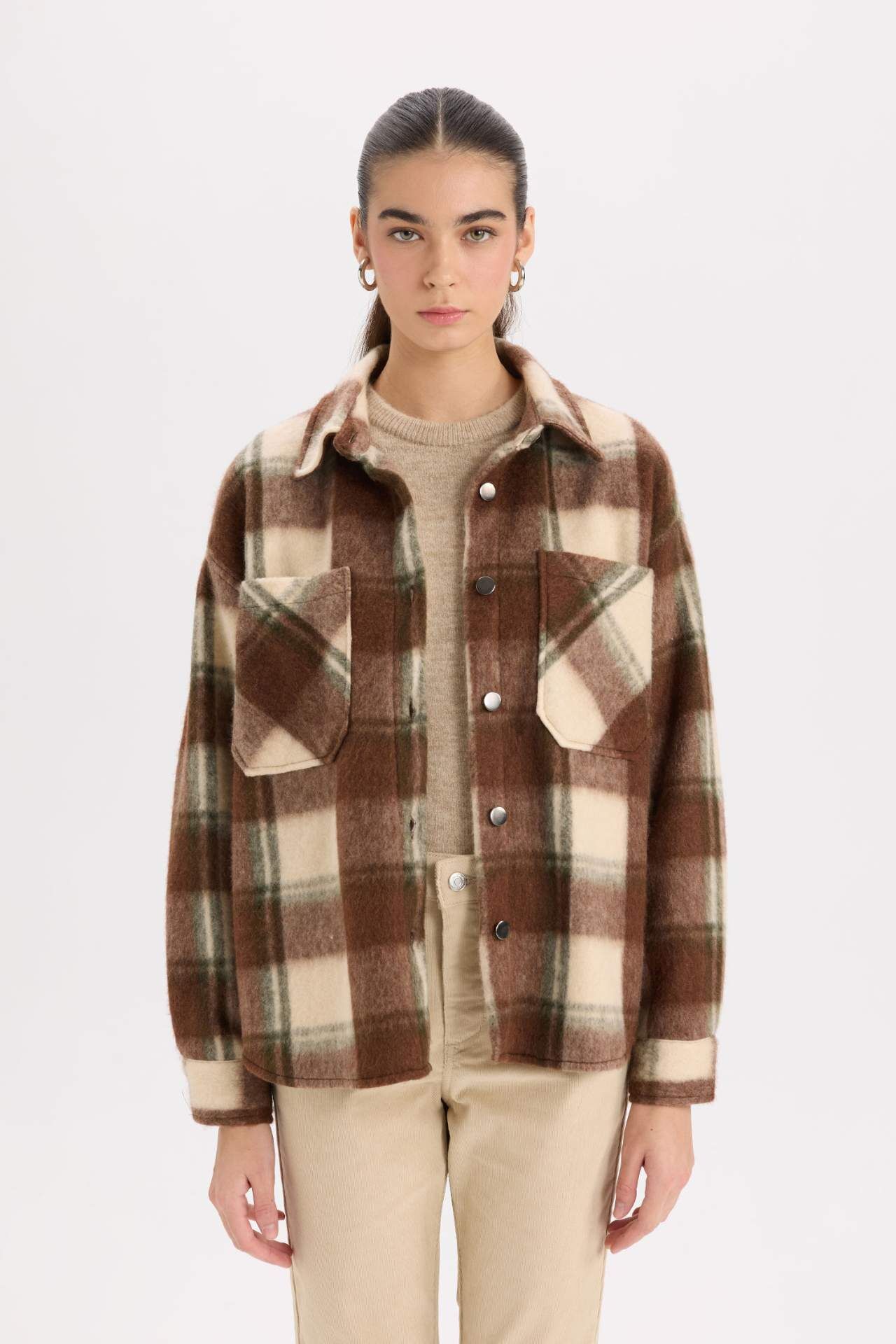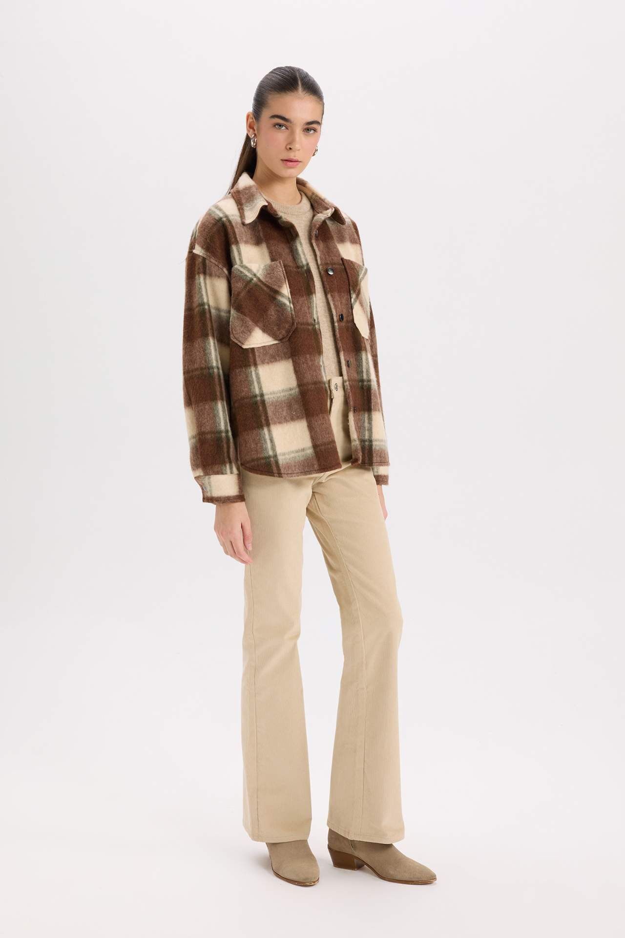 DeFacto Oversize Fit Geniş Kalıp Gömlek Yaka Flanel Uzun Kollu Gömlek