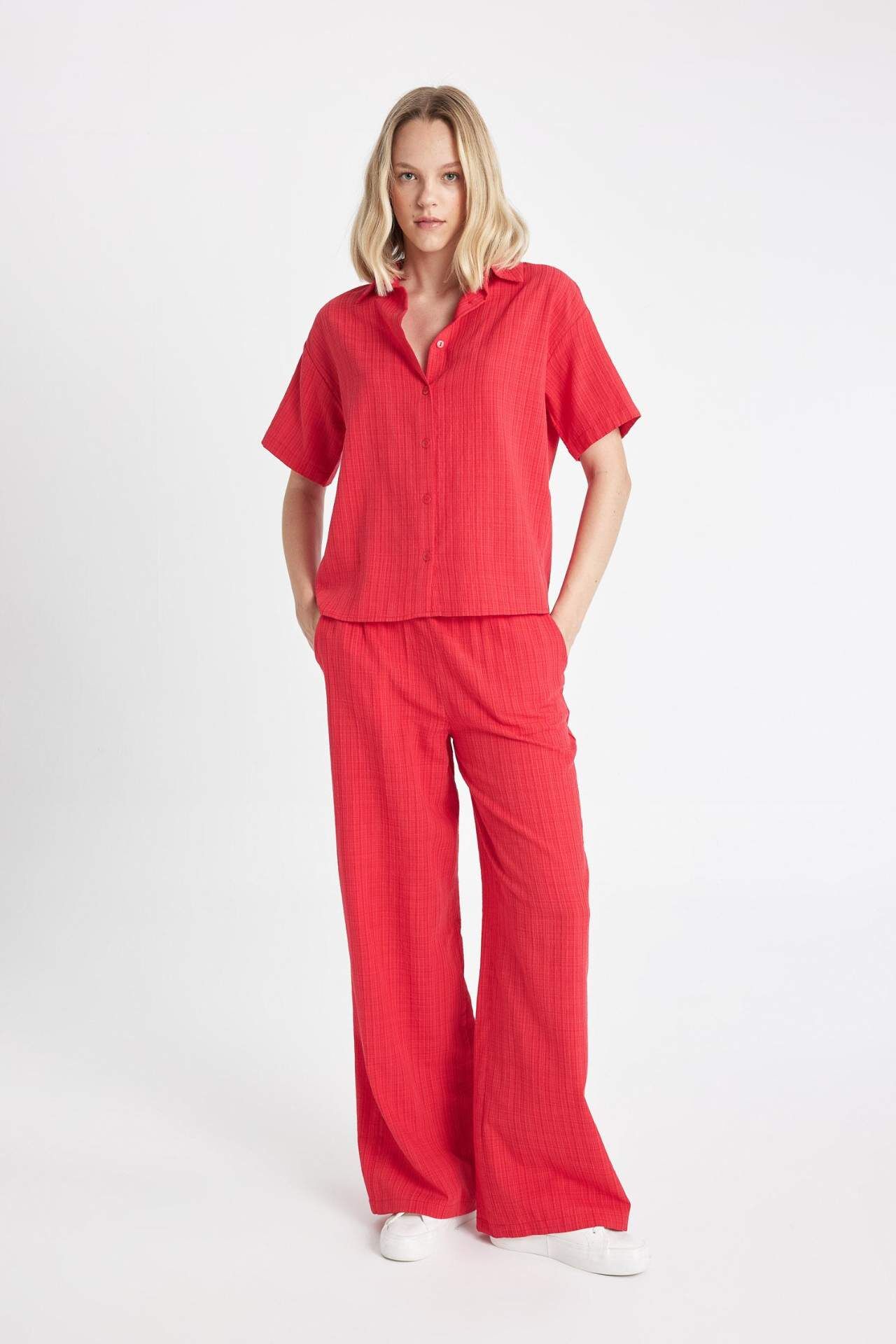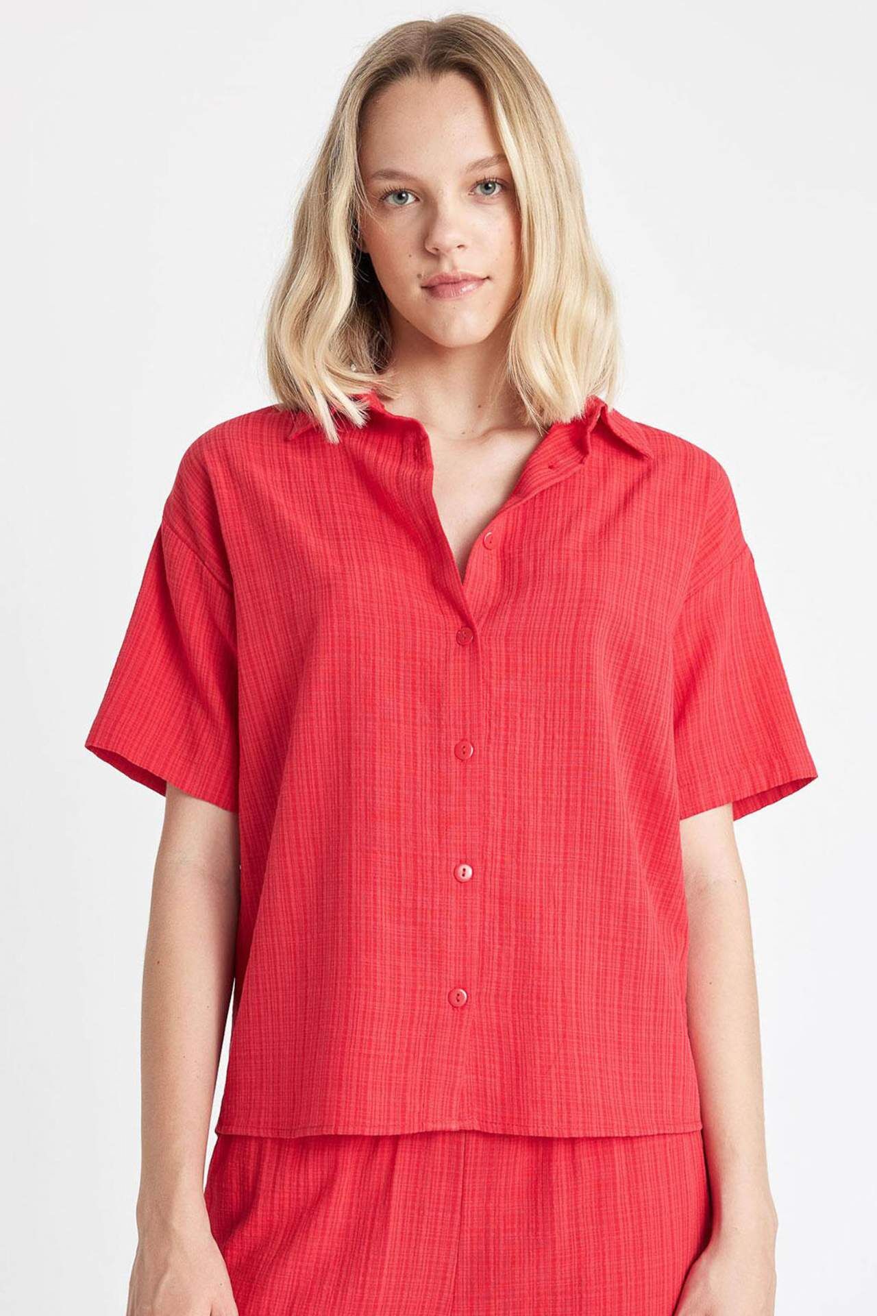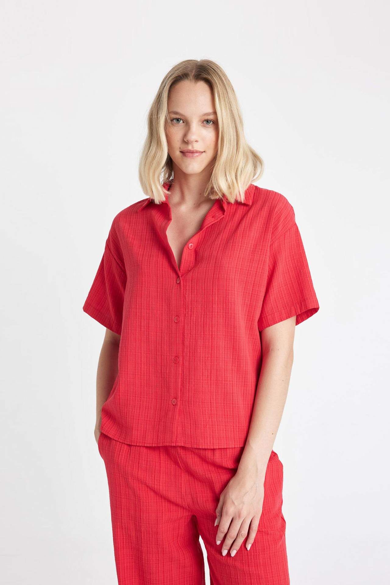 DeFactoFit Oversize Fit Keten Görünümlü Kısa Kollu Gömlek