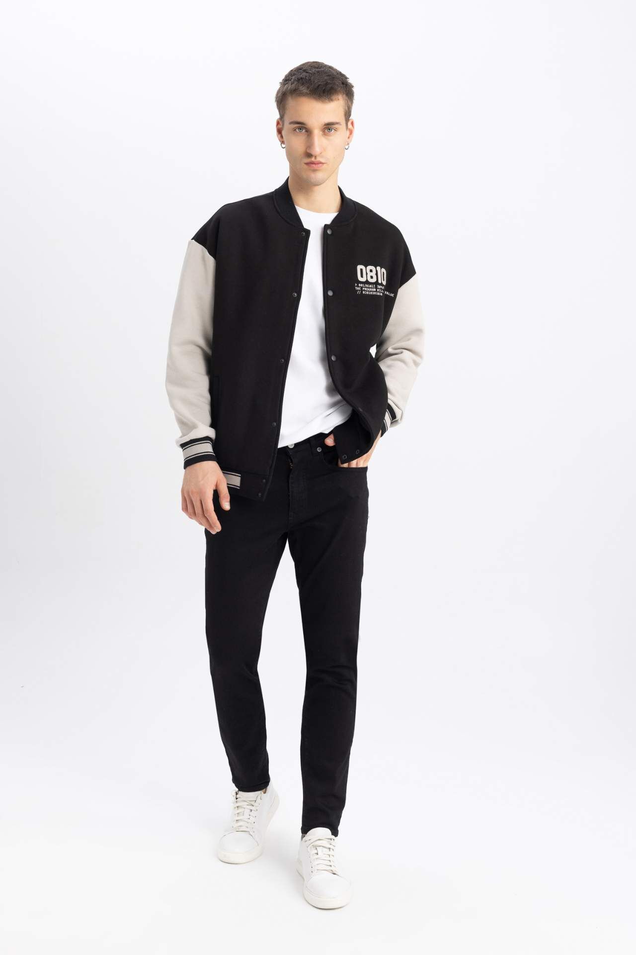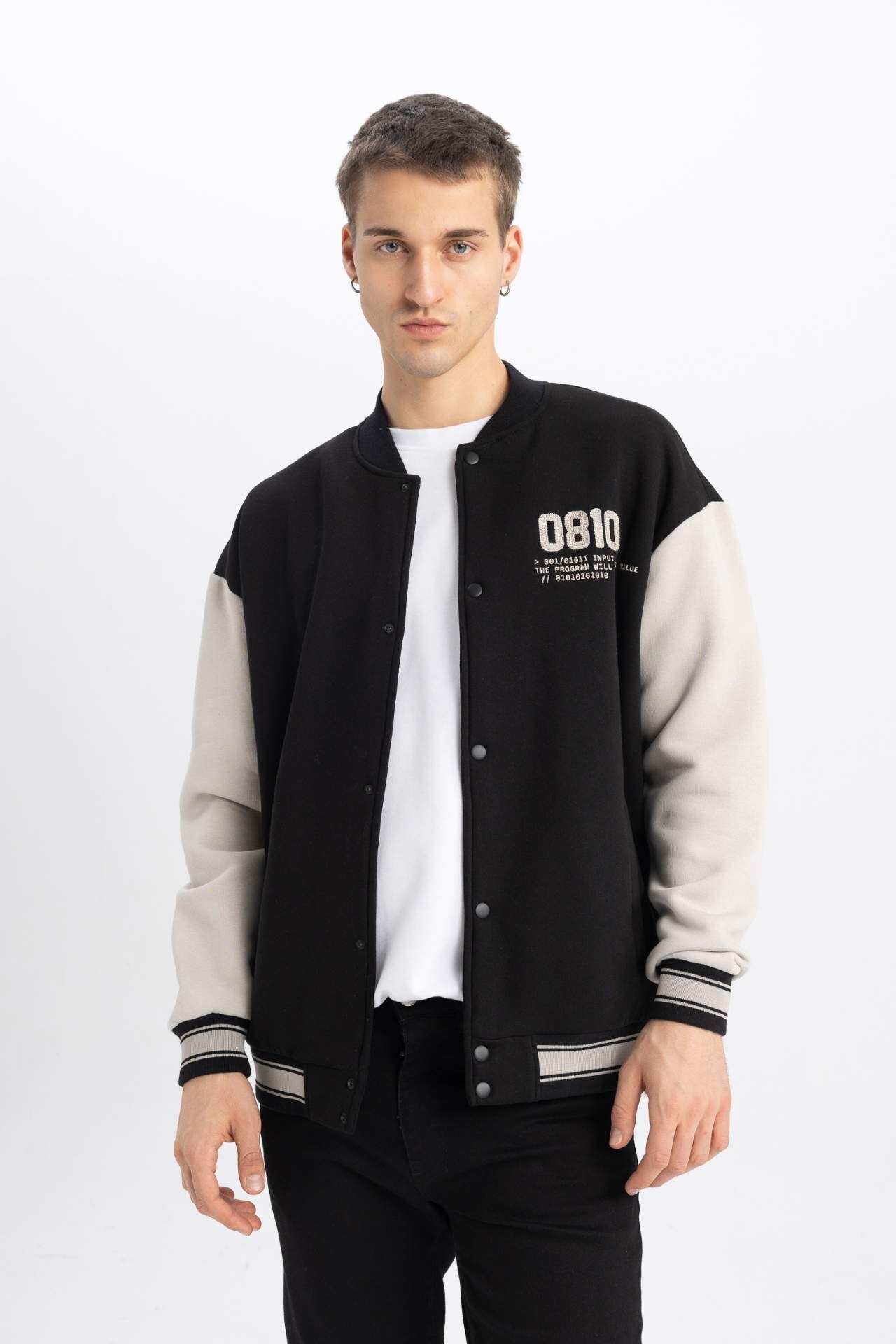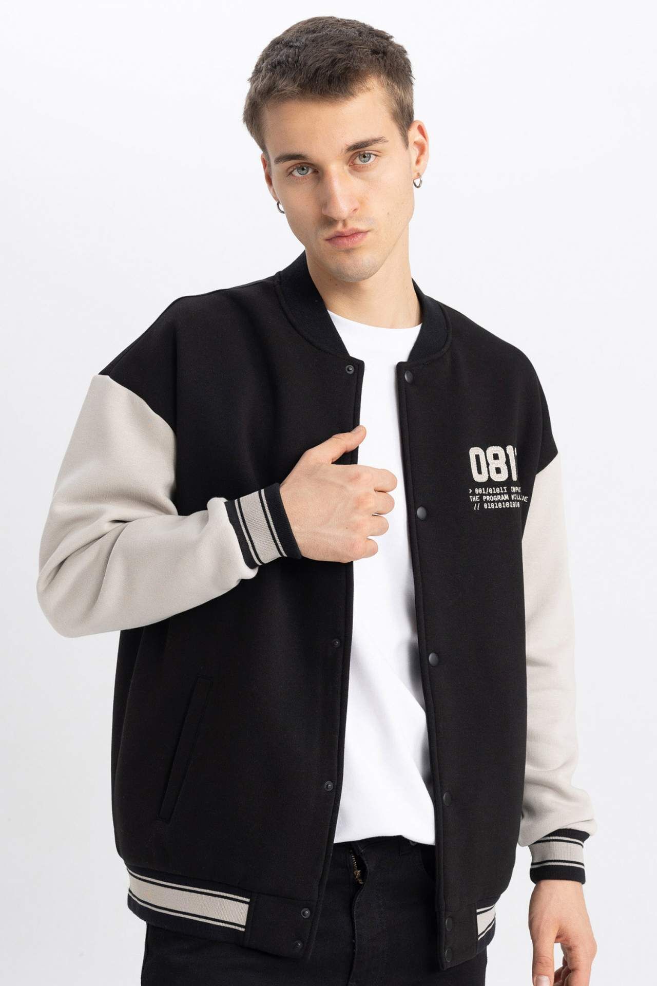 DeFacto Oversize Fit Kolej Yaka Bomber Baskılı İçi Yumuşak Tüylü Kalın Kumaş Hırka