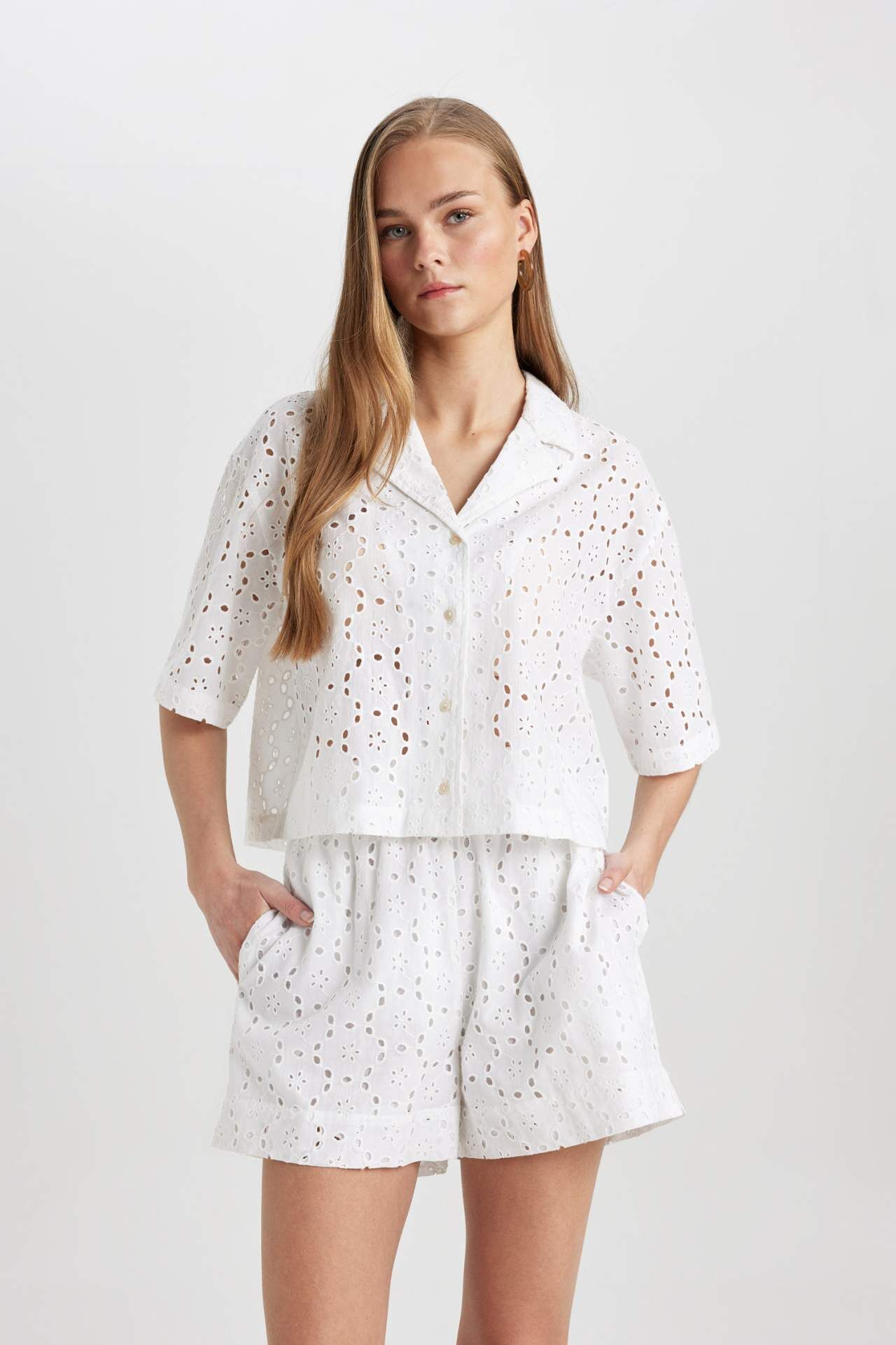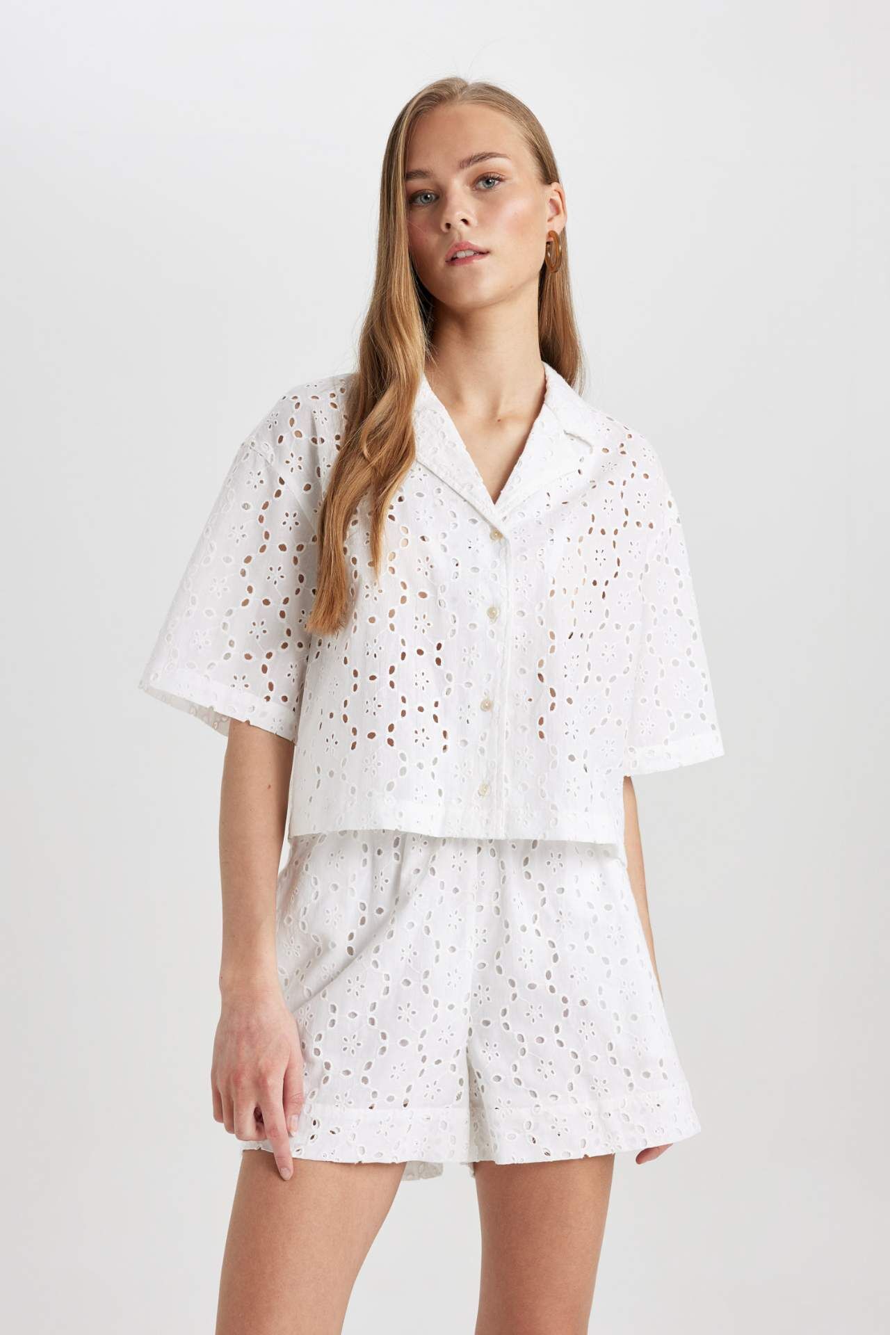 DeFacto Oversize Fit Pijama Yaka Nakışlı Brode Kısa Kollu Gömlek
