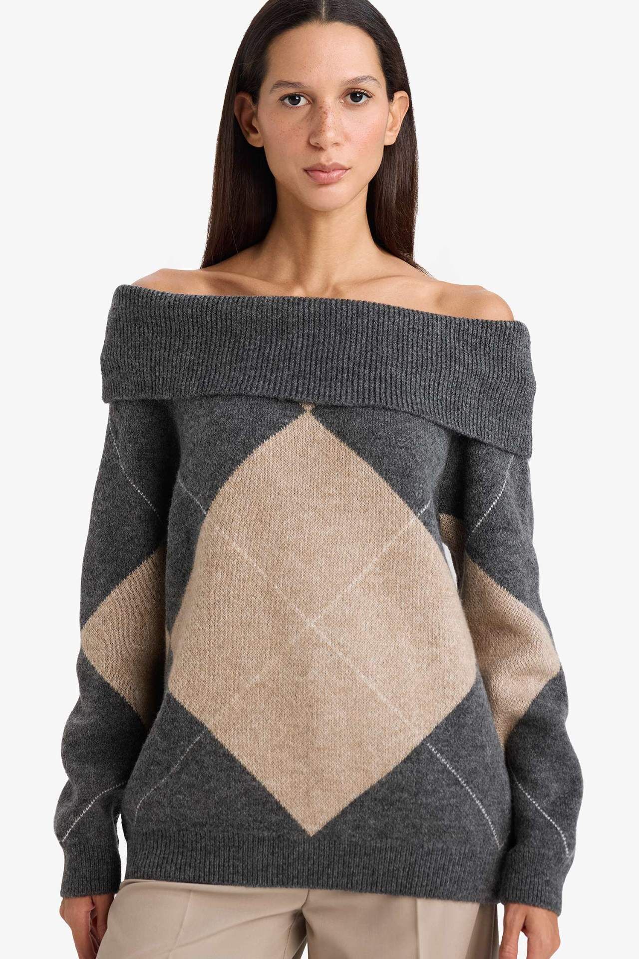 Oversize Geniş Kalıp Açık Omuz Baklava Desenli Triko Kazak