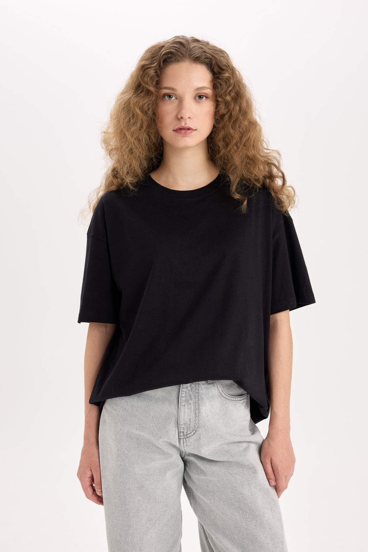 DeFacto Oversize Geniş Kalıp Basic Düz Bisiklet Yaka Kısa Kollu Tişört V4136AZ25SMBK81