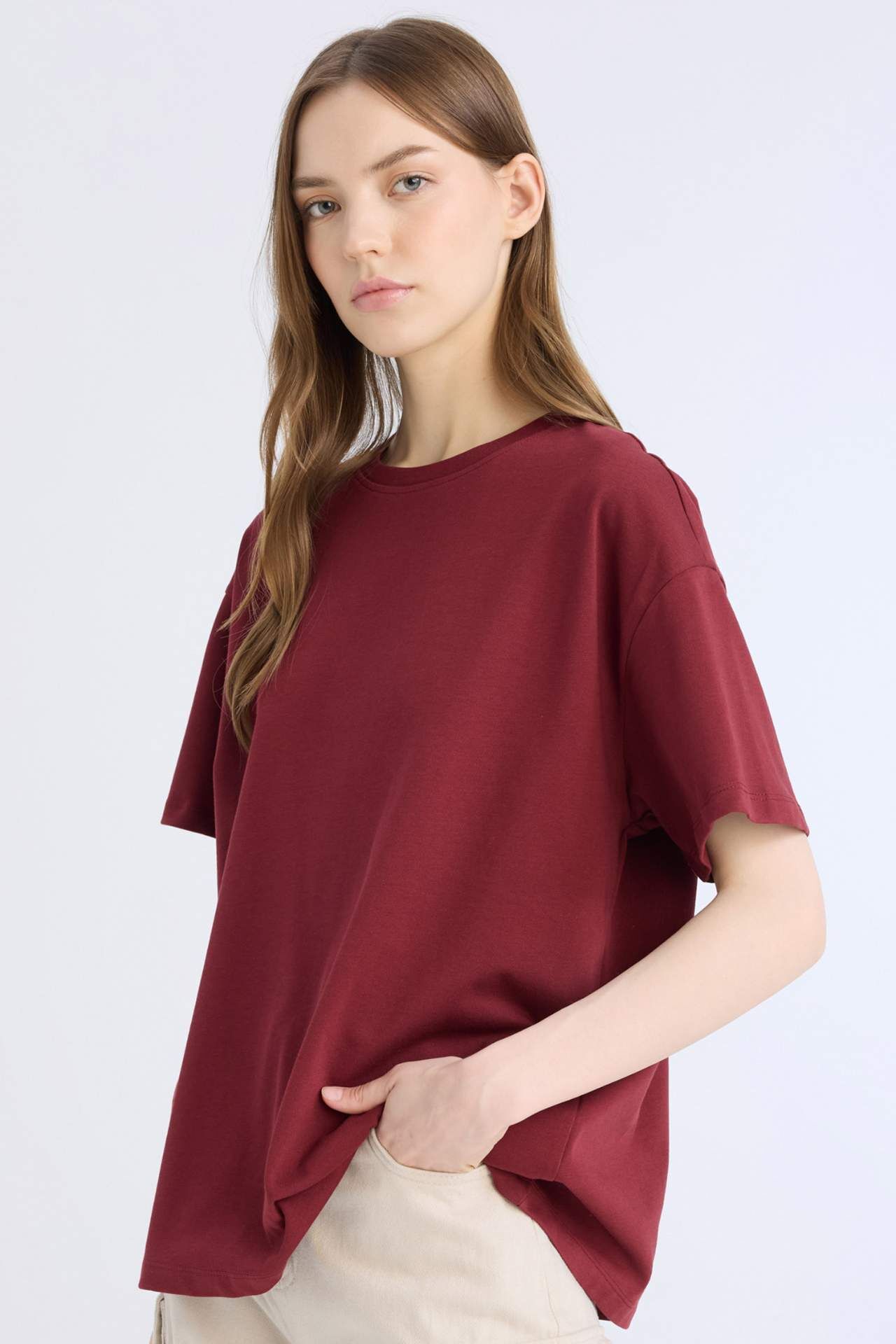 Yetişkin kadınlar için yaz mevsimi için ideal olan örme kumaştan üretilmiş bordo kısa kollu tişört. Oversize geniş kalıbı ve düşük omuz detayı ile şıklığı ve rahatlığı bir arada sunar. Bisiklet yaka ve düz paça detaylarıyla tarzınızı tamamlayın. Pamuk 100%,Pamuk 100%,Pamuk 100%,Pamuk 100%