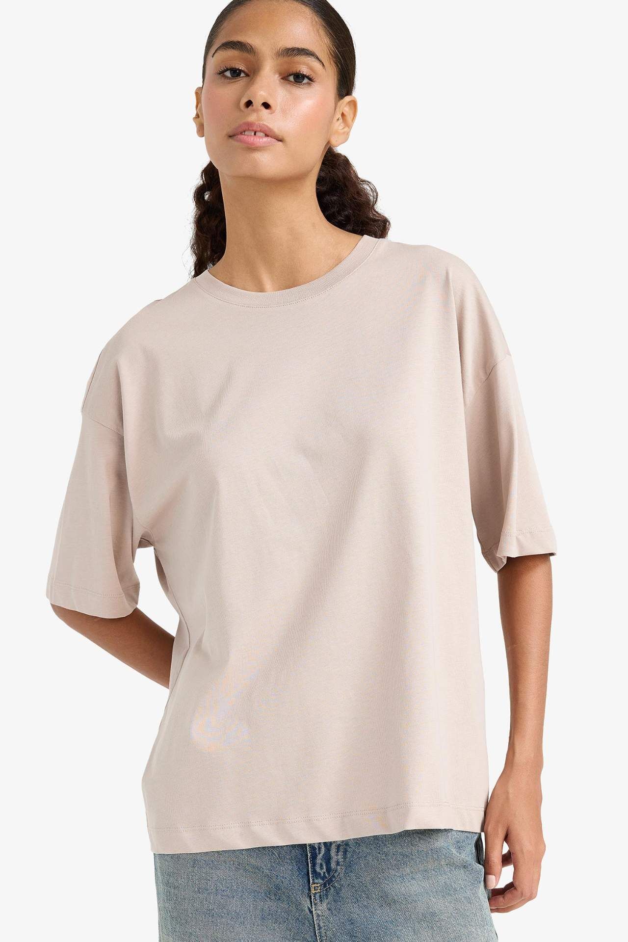 DeFacto Oversize Geniş Kalıp Bisiklet Yaka Basic Düz Penye Kısa Kollu Tişört C0099AX25AUBG130