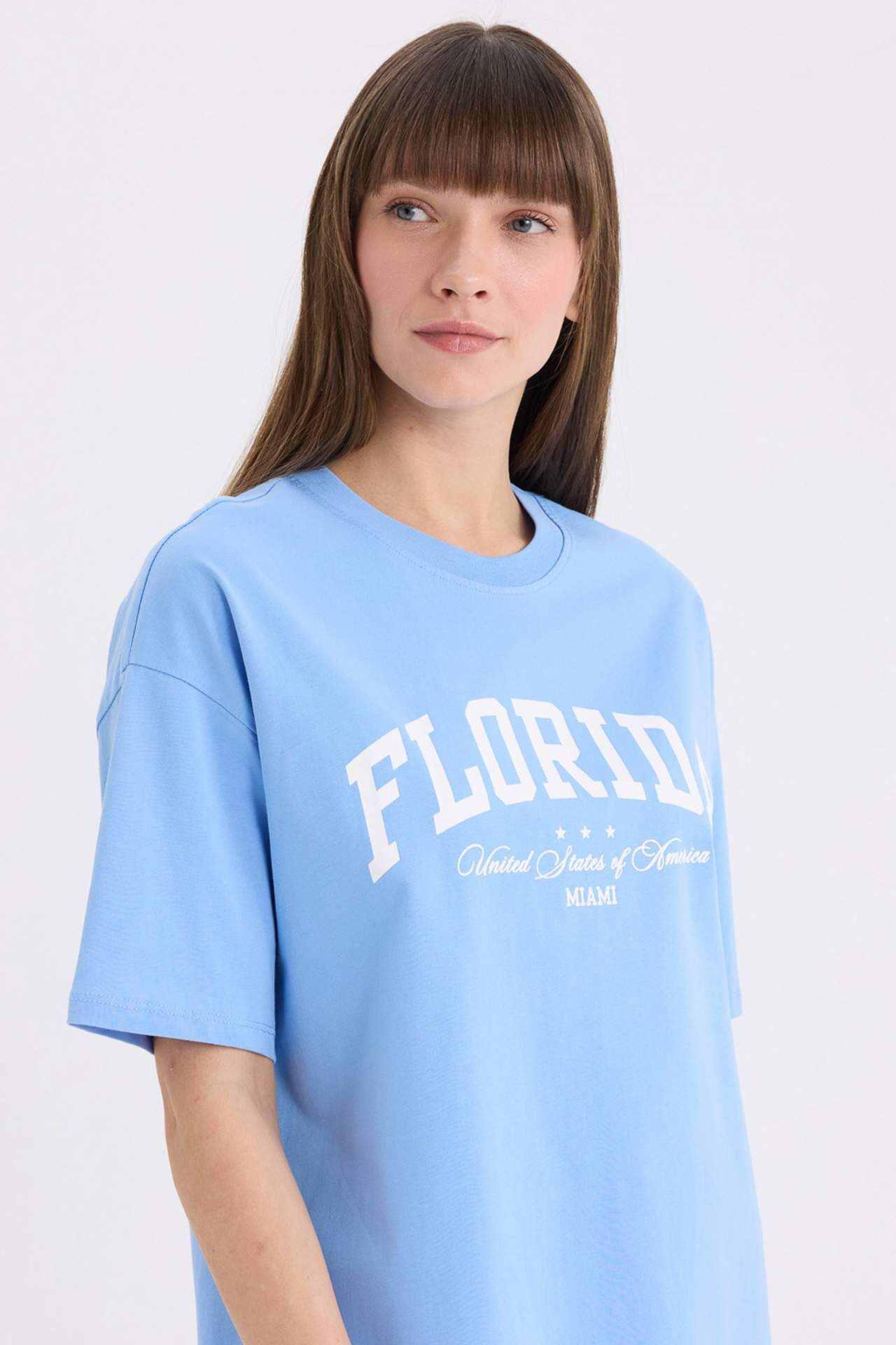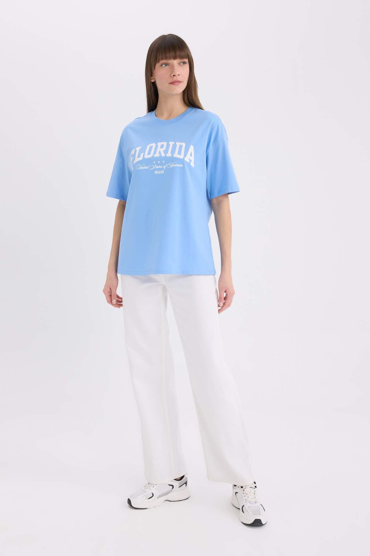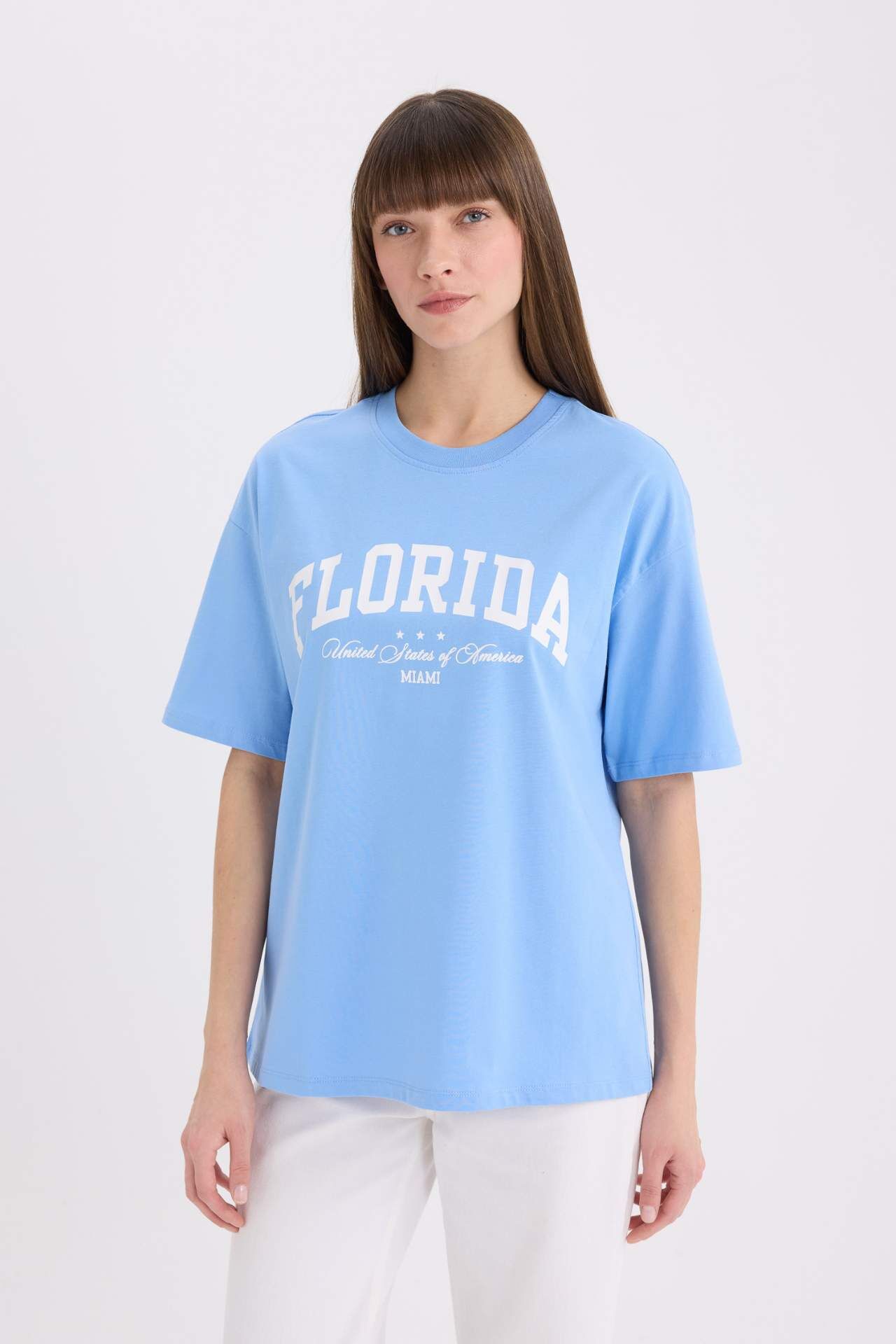 DeFacto Oversize Geniş Kalıp Bisiklet Yaka Baskılı Casual Kısa Kollu Tişört E5056AX25SPBE552