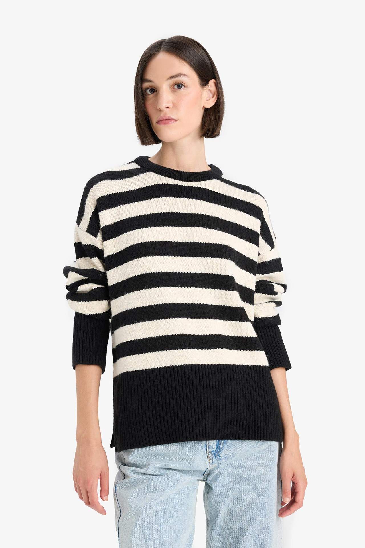 Oversize Geniş Kalıp Bisiklet Yaka Çizgili Triko Kazak