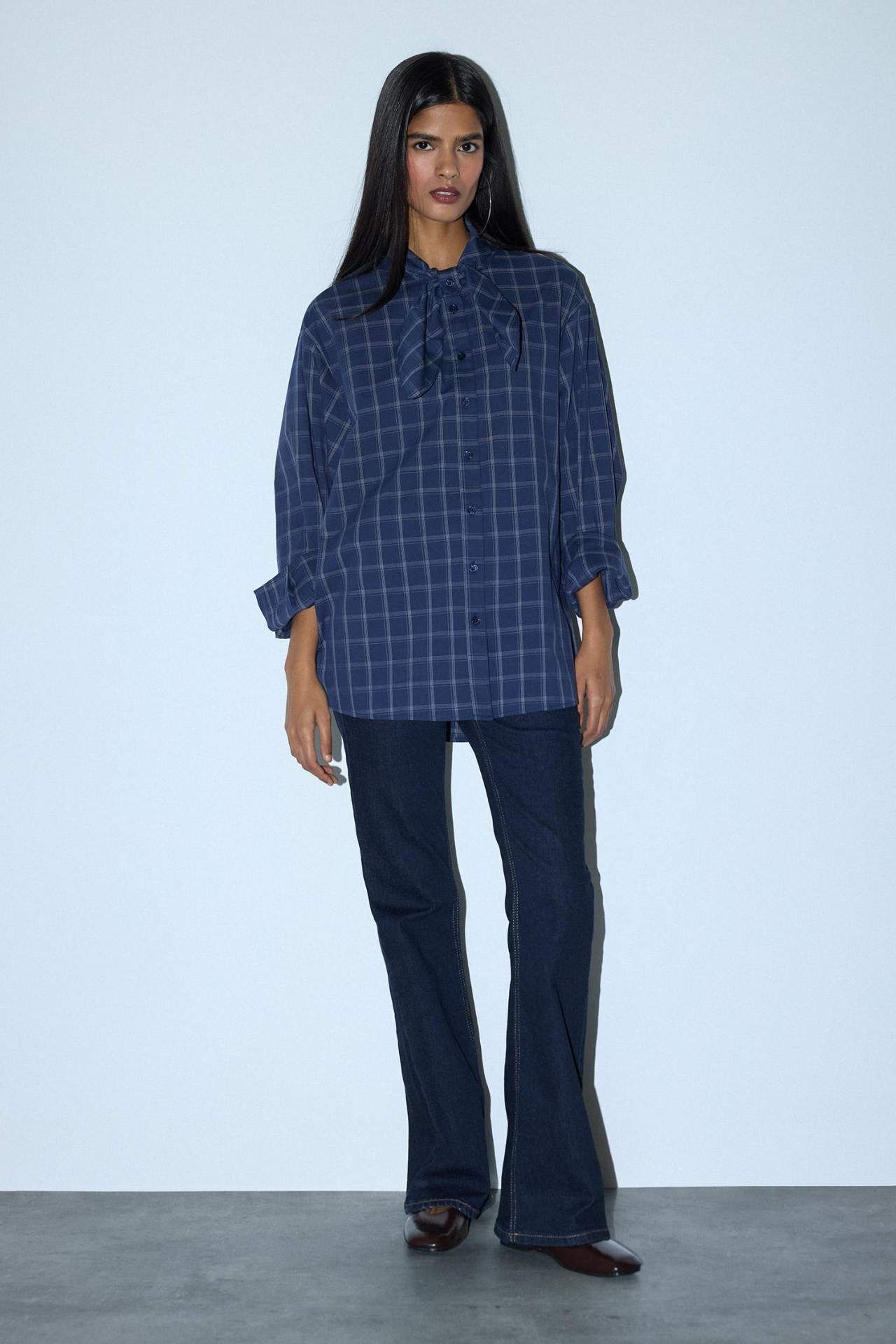 Oversize Geniş Kalıp Fular Yaka Kareli Poplin Uzun Kollu Gömlek