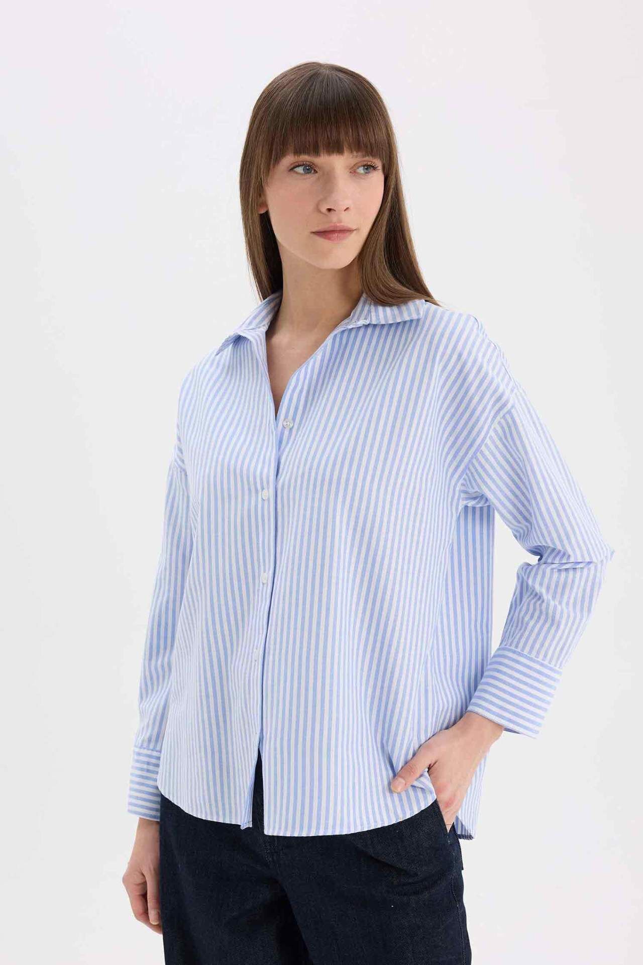 Oversize Geniş Kalıp Gömlek Yaka Çizgili Oxford Uzun Kollu Gömlek