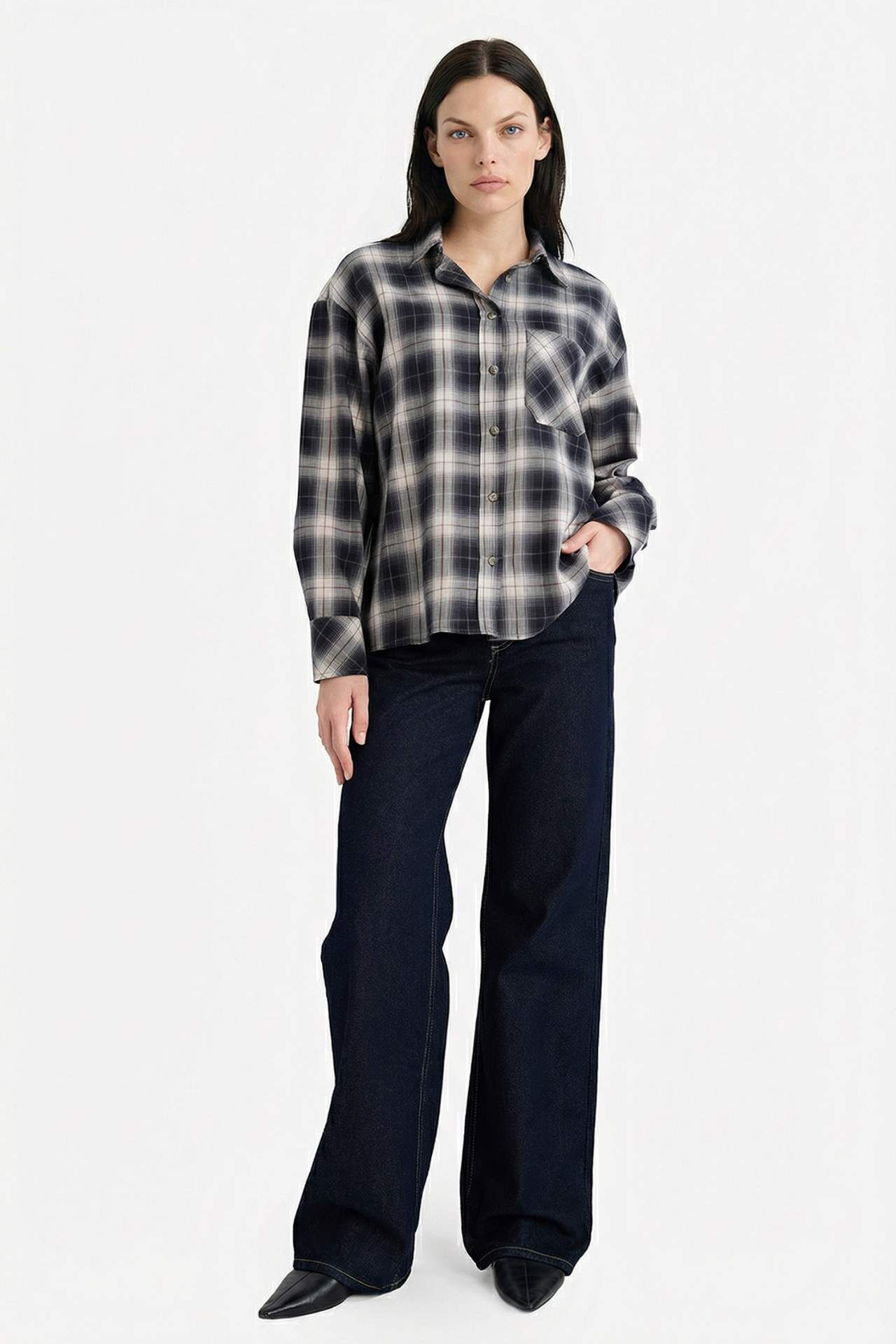 Oversize Geniş Kalıp Gömlek Yaka Kareli Flanel Uzun Kollu Gömlek