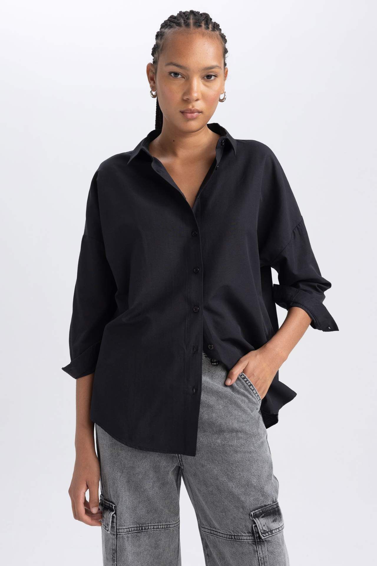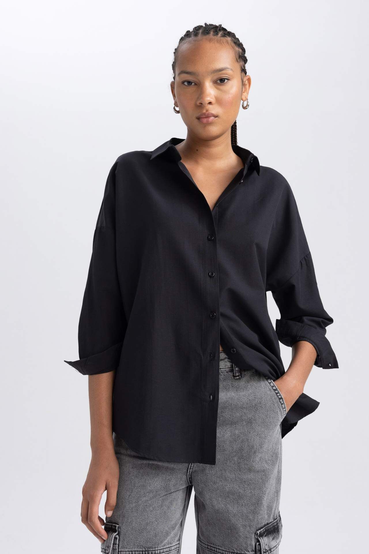 Oversıze Geniş Kalıp Gömlek Yaka Poplin Uzun Kollu Tunik