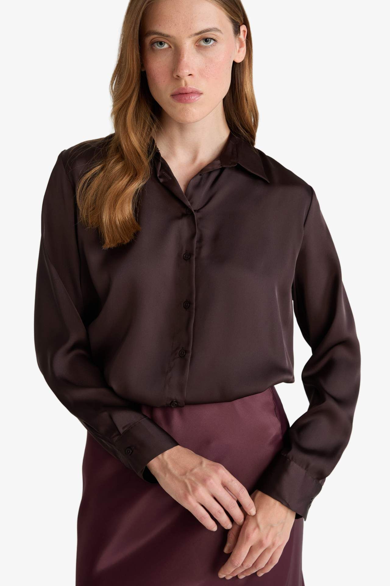 Oversize Geniş Kalıp Gömlek Yaka Saten Uzun Kollu Gömlek