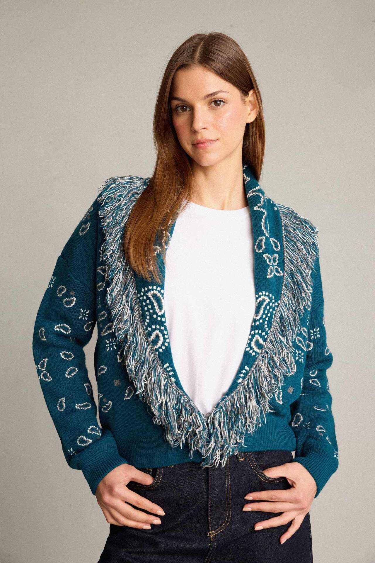 Oversize Geniş Kalıp Püskül Detaylı Triko Hırka, yumuşak triko dokusu ve rahat kesimiyle konforlu bir kullanım sunar. Püskül detaylarıyla şık ve modern bir görünüm sağlar. Akrilik 100%,Akrilik 100%,Akrilik 100%,Akrilik 100%,Akrilik 100%,Akrilik 100%,Akrilik 100%