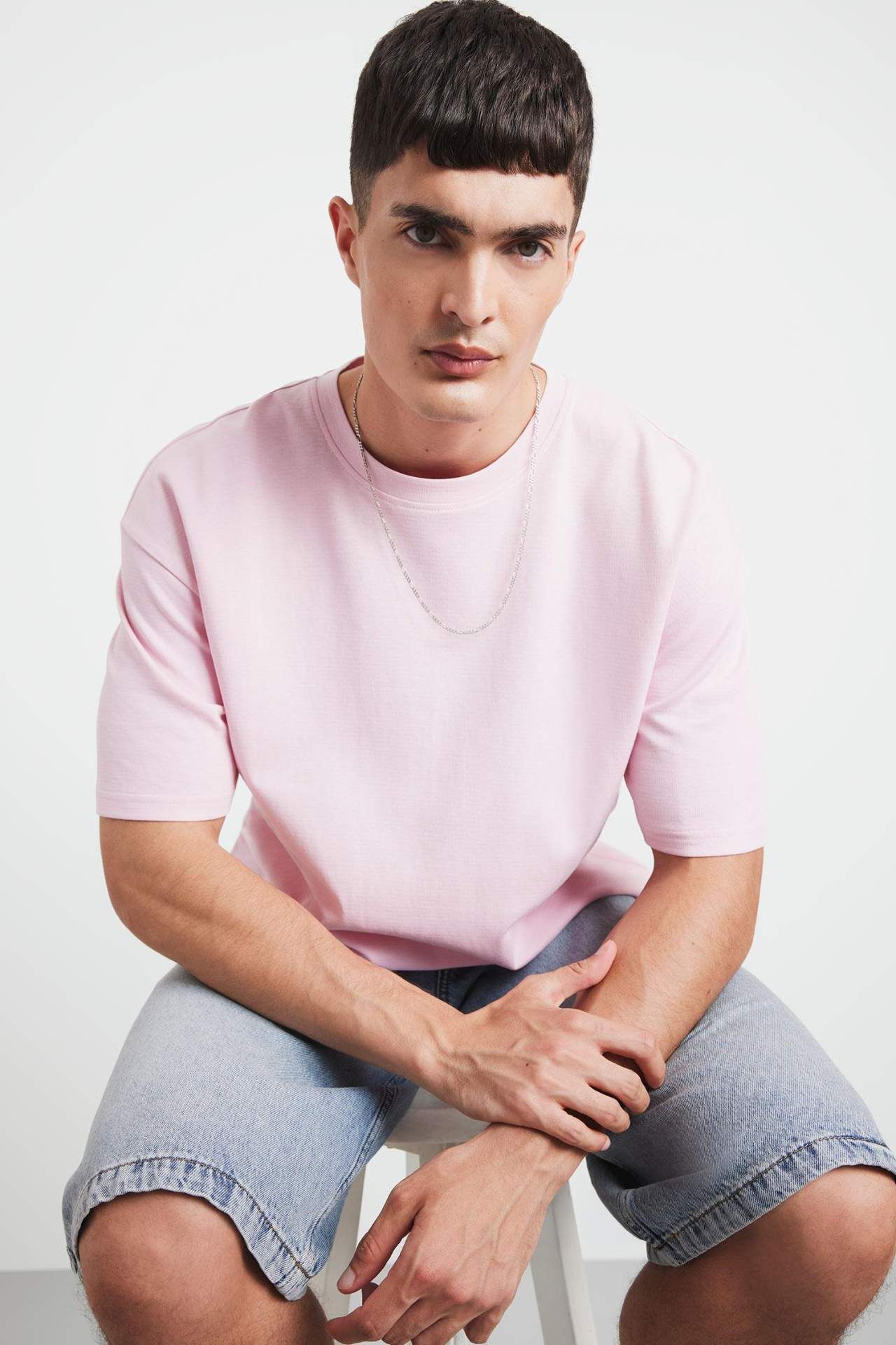 DeFacto Oversize Geniş Kalıp Ütü Gerektirmeyen Bisiklet Yaka Kısa Kollu Basic Düz Ağır Kumaş Tişört X3926AZ25SPPR345