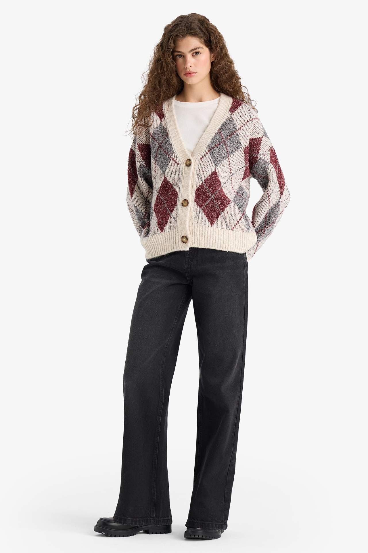 DeFacto Oversize Geniş Kalıp V Yaka Baklava Desenli Düğmeli Triko Hırka
