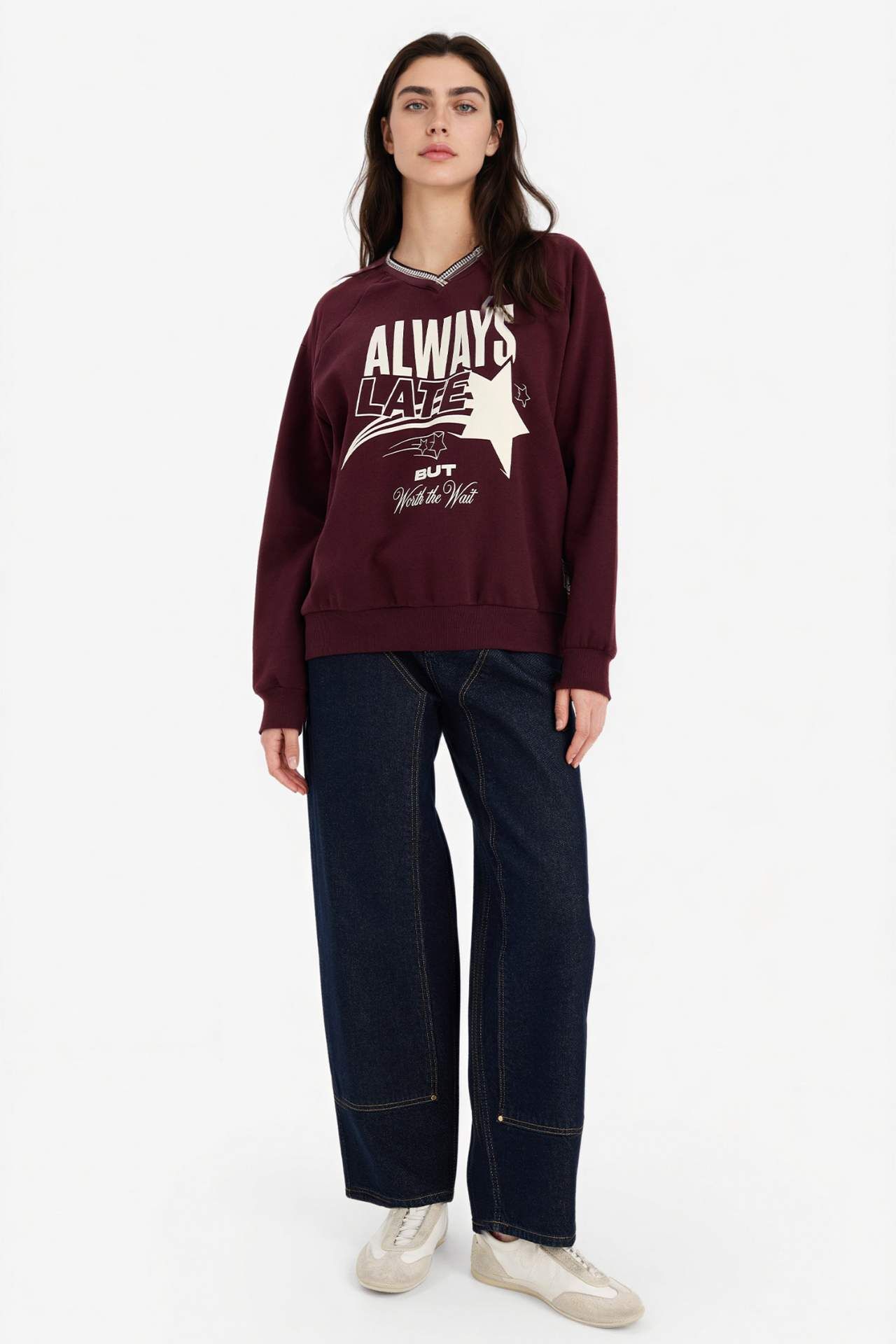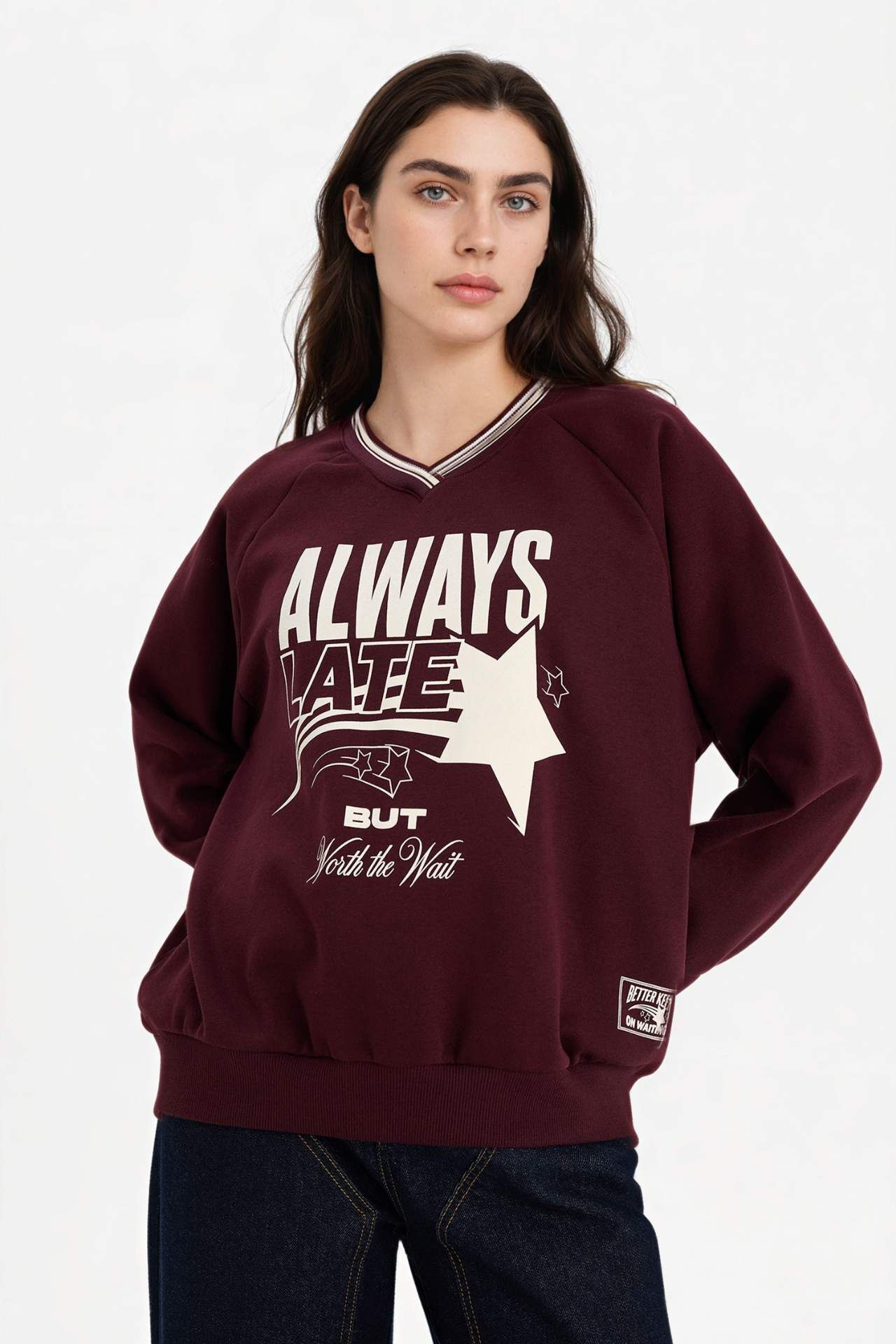 Oversıze Geniş Kalıp V Yaka Baskılı Kalın Kumaş Sweatshirt