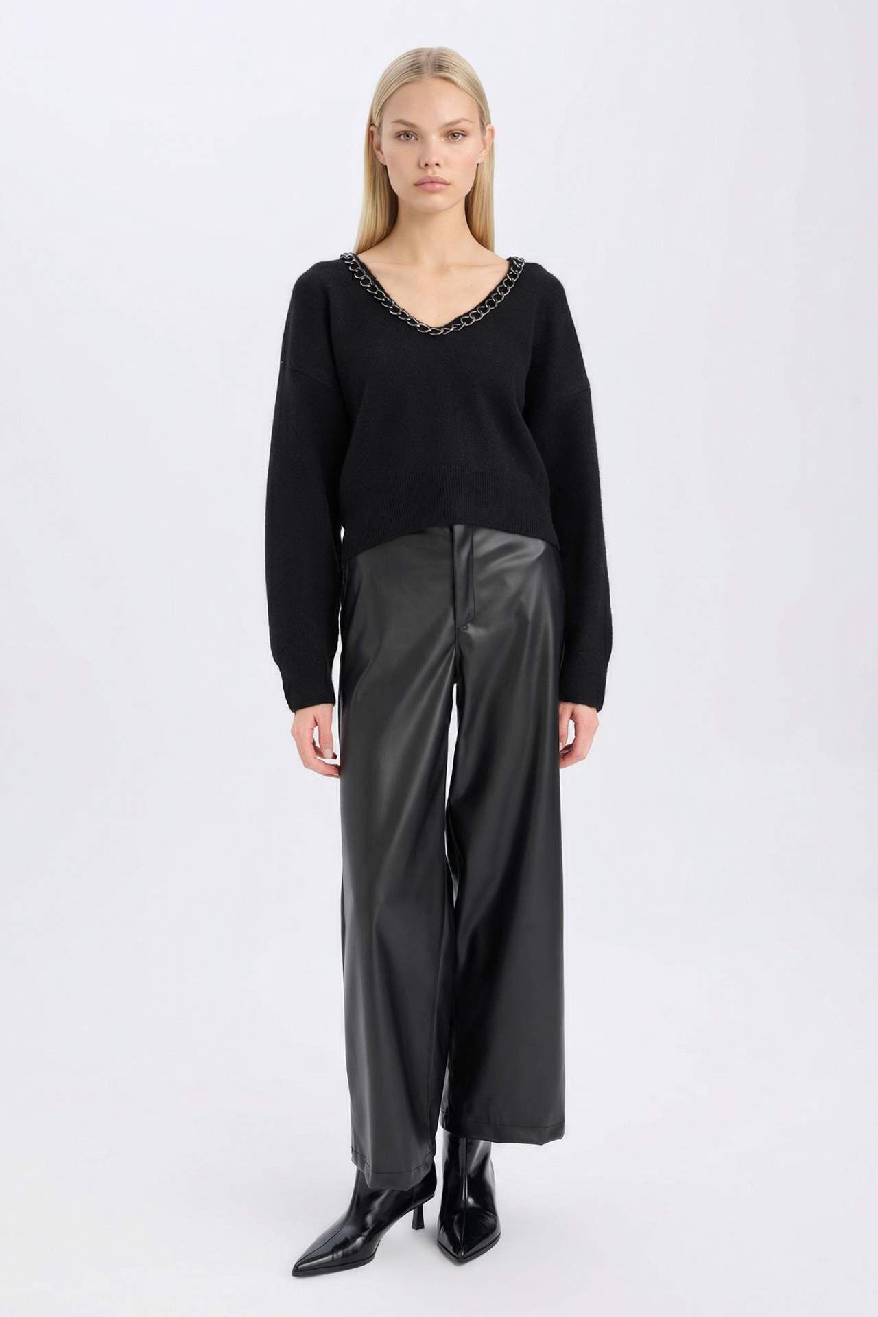 DeFacto Oversize Geniş Kalıp V Yaka Triko Kazak E2309AX24WNBK27