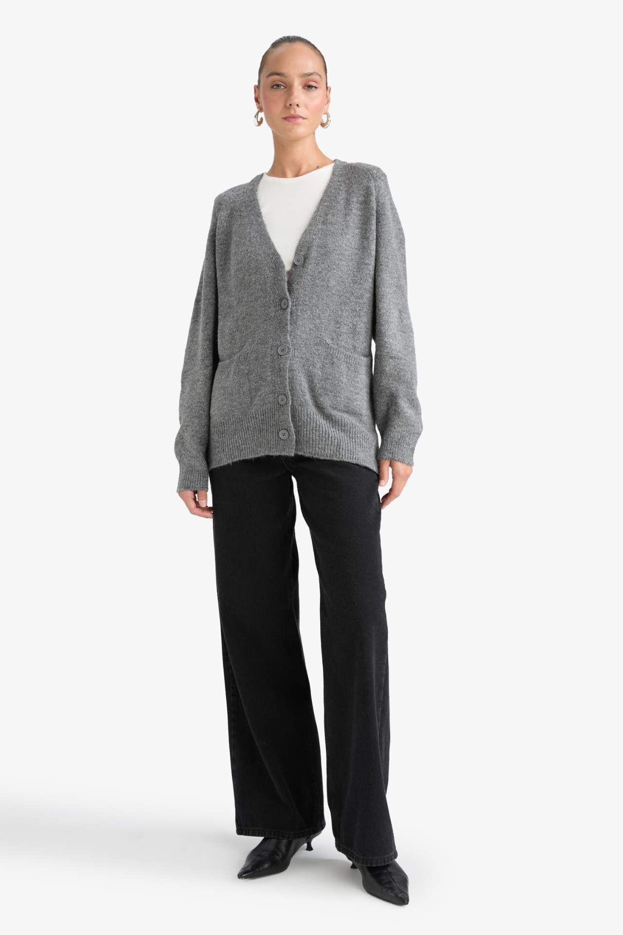 Oversize Geniş Kalıp V Yaka Yumuşak Dokulu Düğmeli Hırka F2902AX25WNGR348