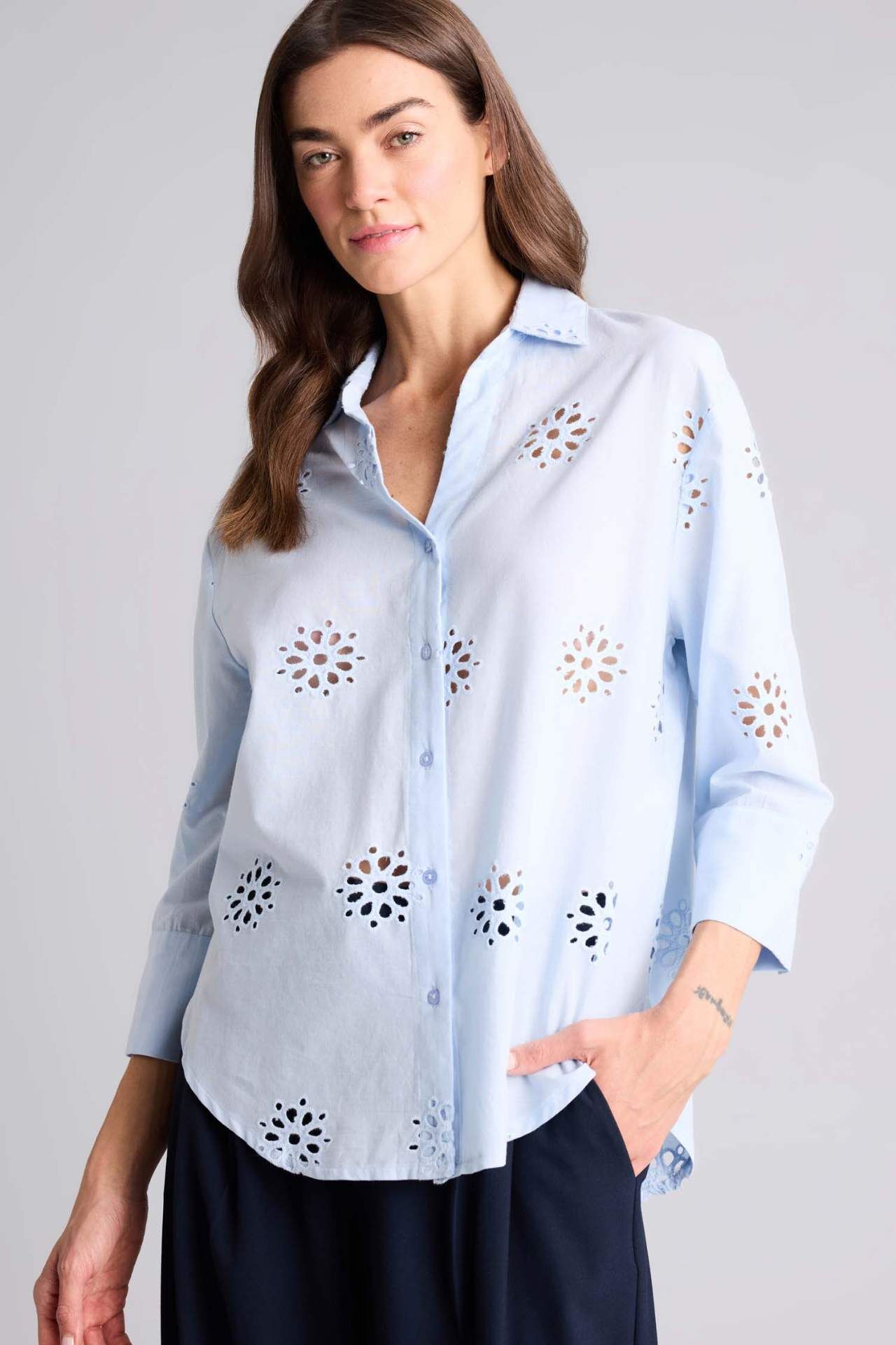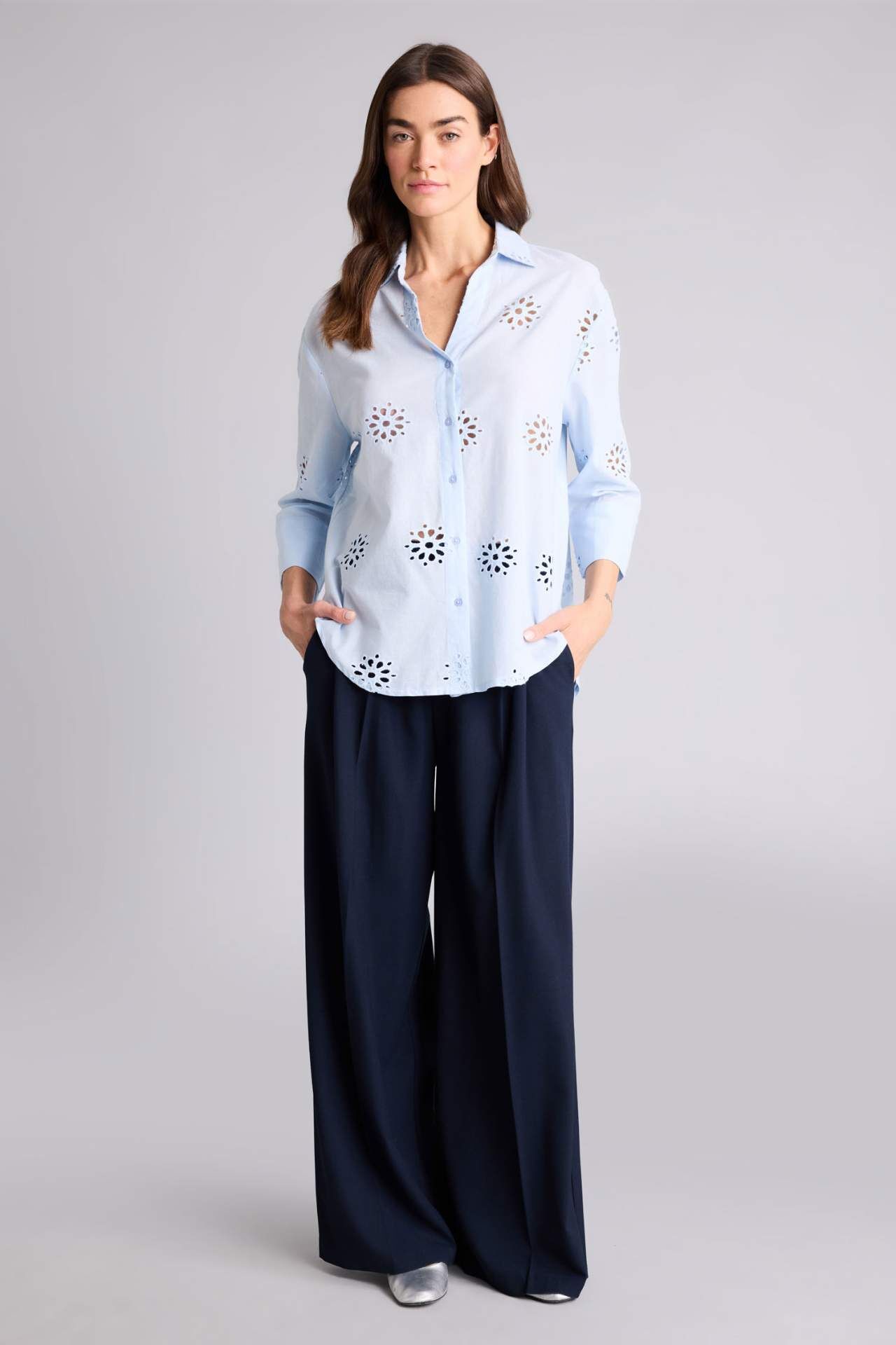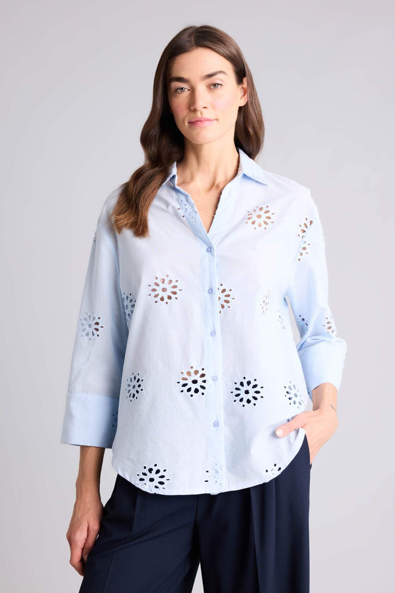 Bu dokuma üst, uzun kollu gömlek, stilinizi tamamlar. Oversize kalıbıyla rahatlık sunar. Brode kumaşı ve mavi rengiyle dikkat çeker. Yarım kollu ve oval paça detayıyla şık bir görünüm sunar. İlkbahar/Yaz mevsim koşullarına uygun olan bu gömlek, temel bir parçadır. Pamuk 100% Manken Bedeni: Göğüs: 89 Boy: 1,78 Basen: 92 Bel: 63