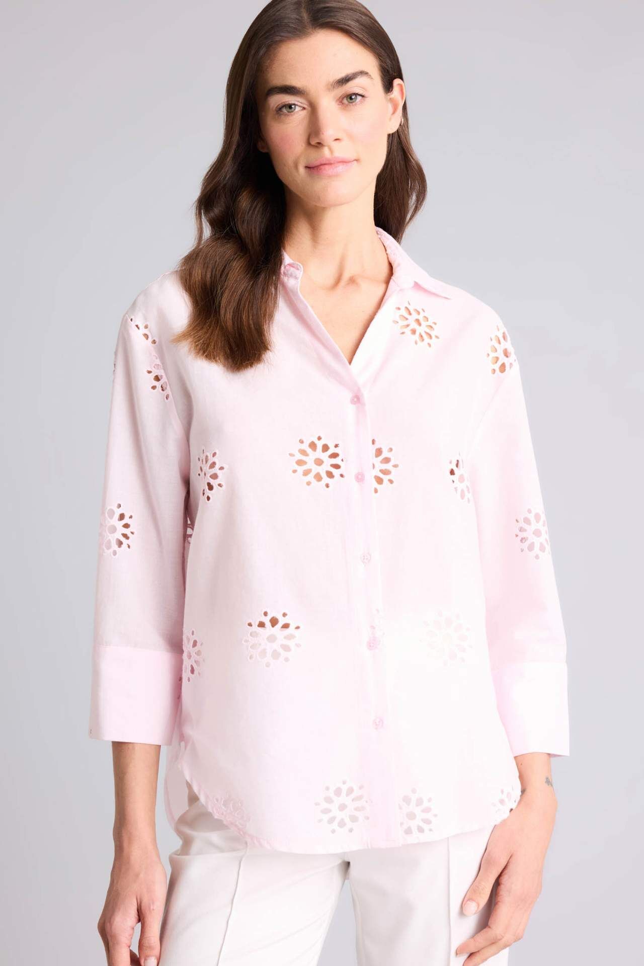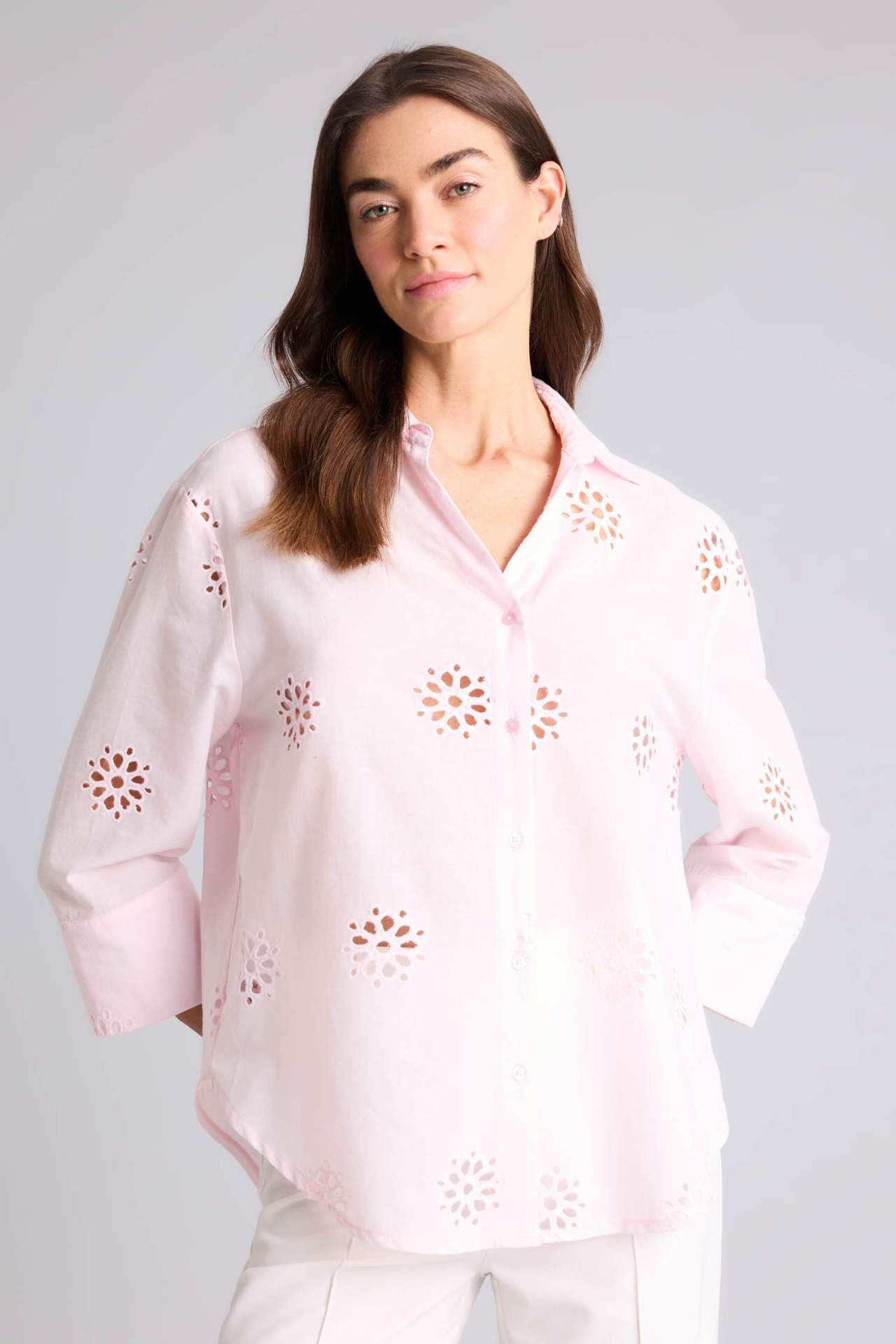 Yetişkin kadınlar için ideal bir seçim olan bu pembe brode uzun kollu gömlek, oversize kesimiyle rahat bir tarz sunar. Yarım kol detayı ve oval paça detayıyla şıklığı tamamlar. İlkbahar/Yaz sezonu için tasarlanmıştır ve şık gömlek yakası ile dikkat çeker. Tarzınızı öne çıkaracak bir parça. Pamuk 100% Manken Bedeni: Göğüs: 89 Boy: 1,78 Basen: 92 Bel: 63