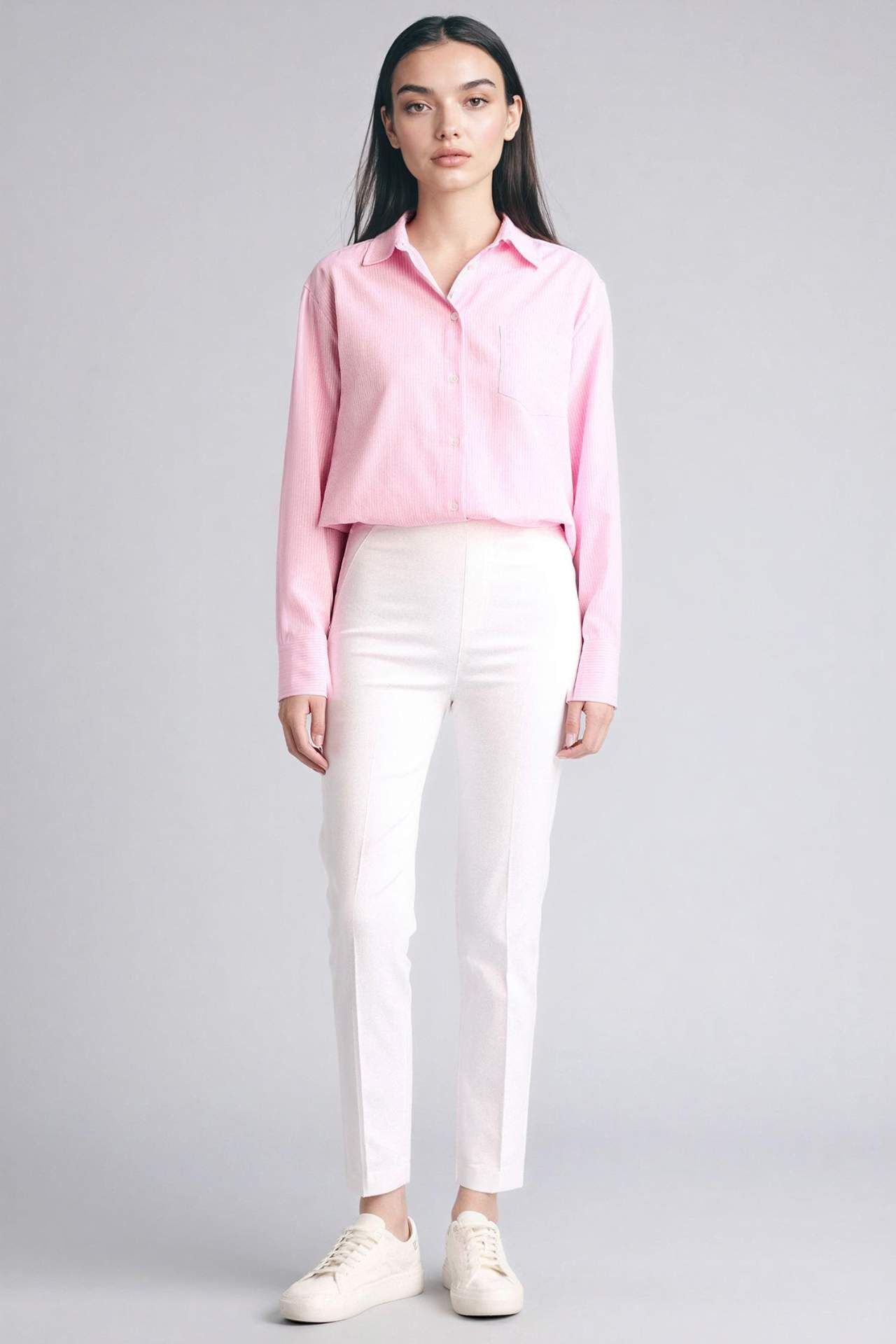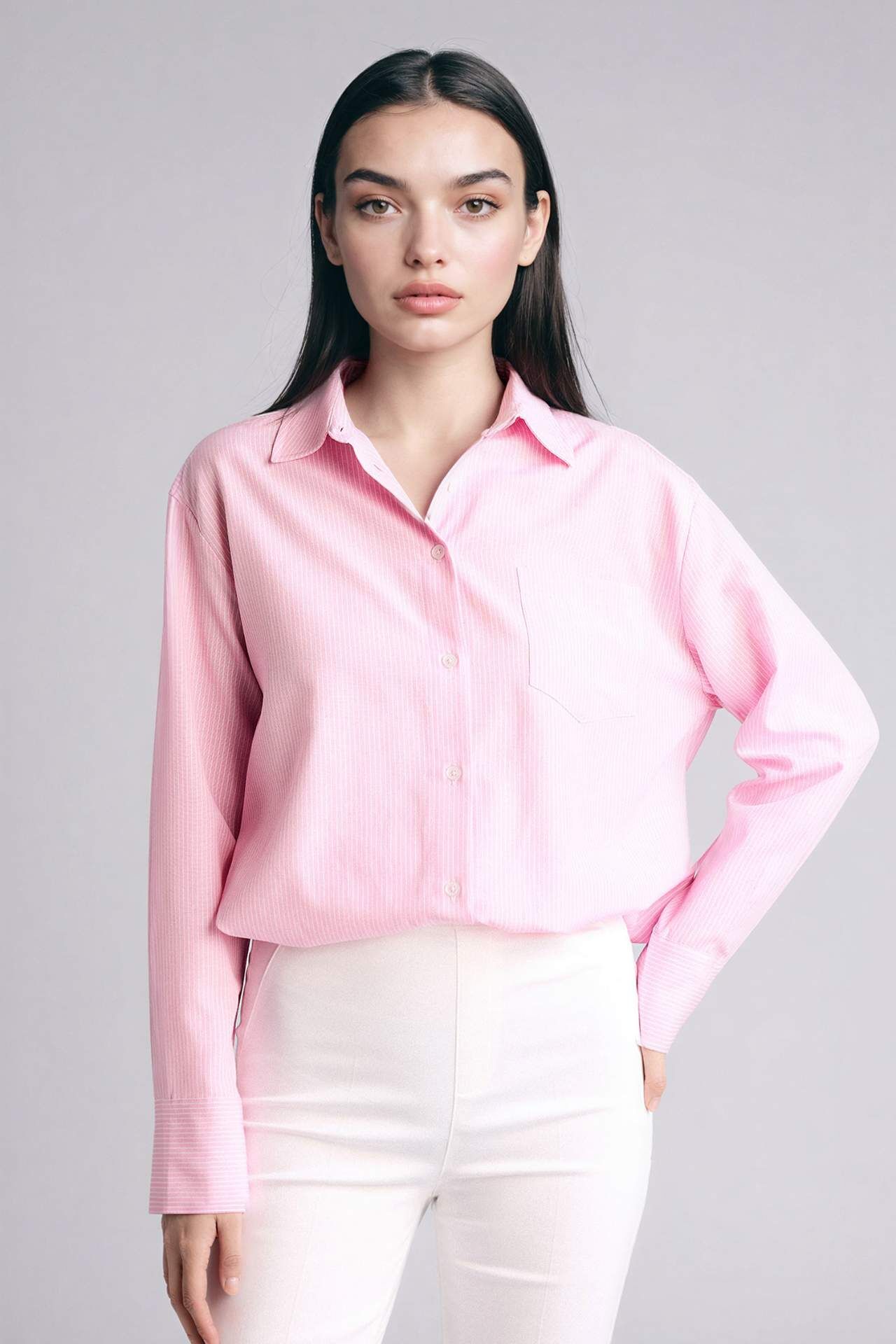 Oversıze Gömlek Yaka Çizgili Oxford Uzun Kollu Gömlek