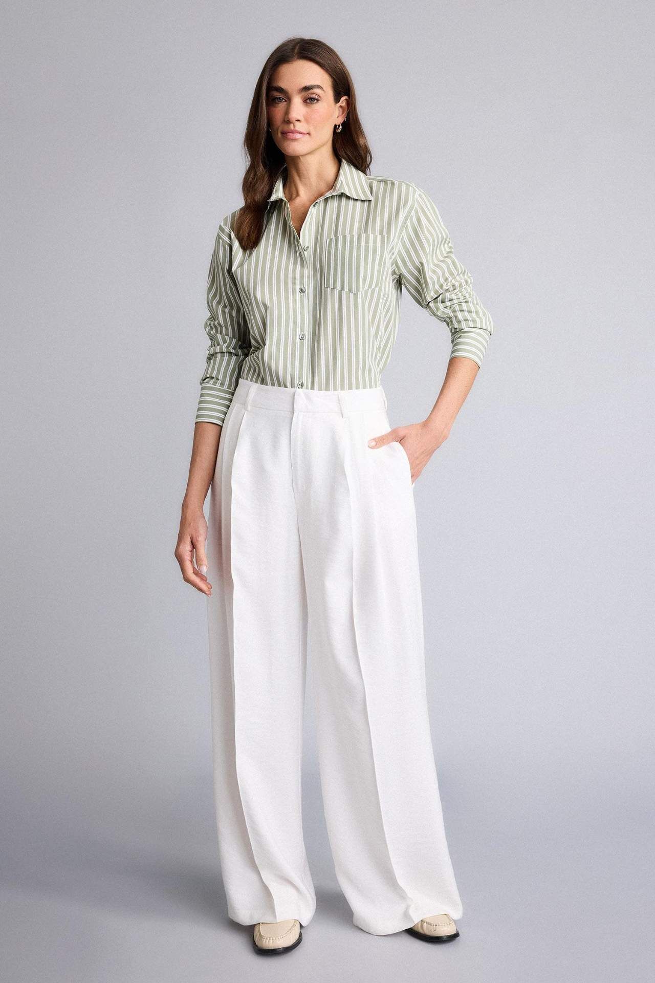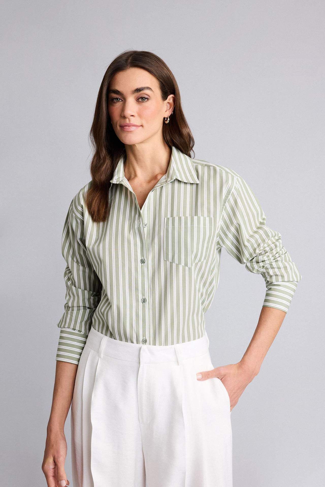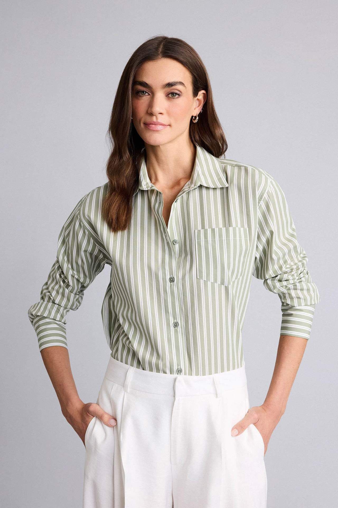Oversıze Gömlek Yaka Çizgili Poplin Uzun Kollu Gömlek