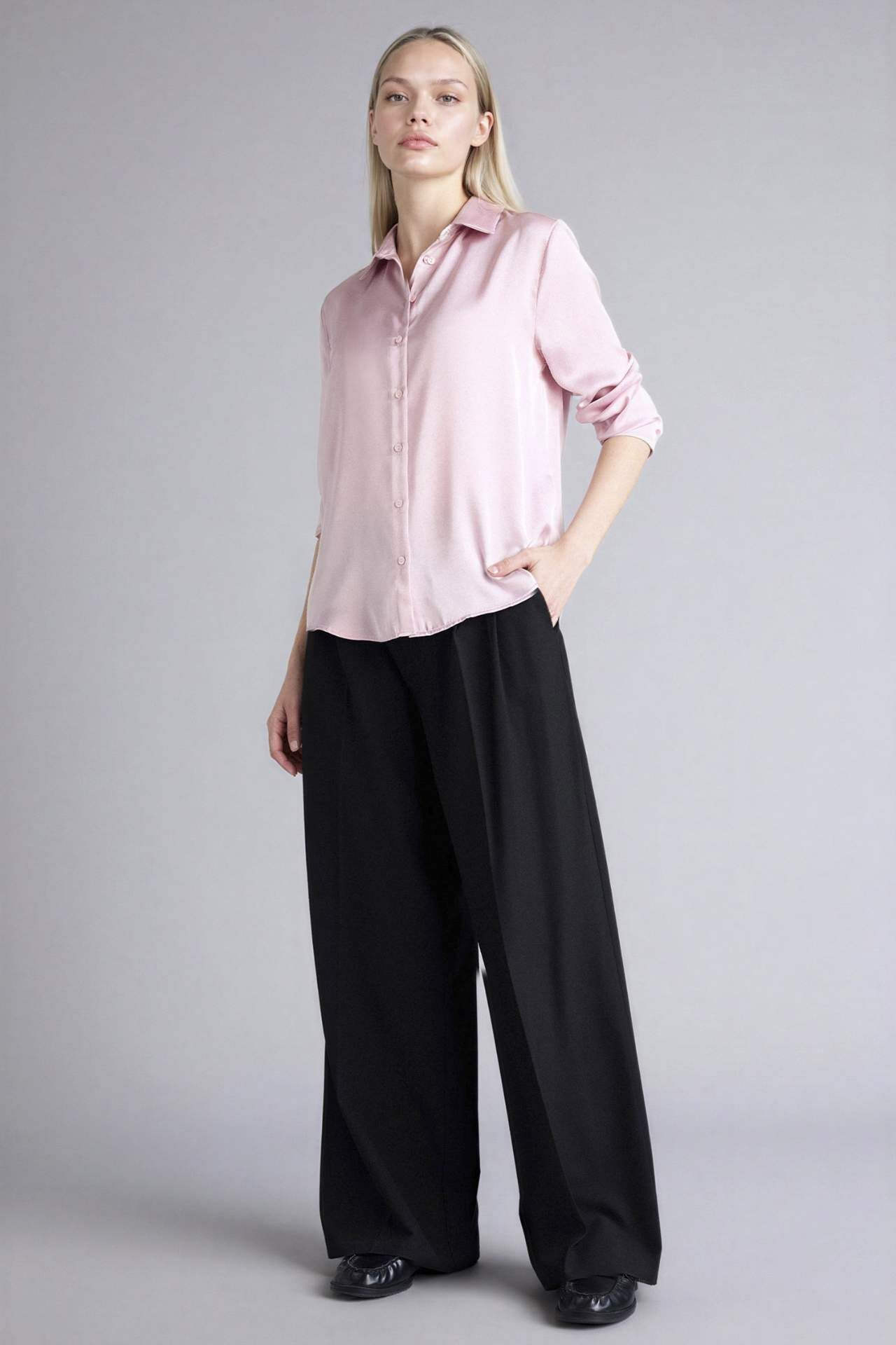 Oversıze Gömlek Yaka Saten Uzun Kollu Gömlek