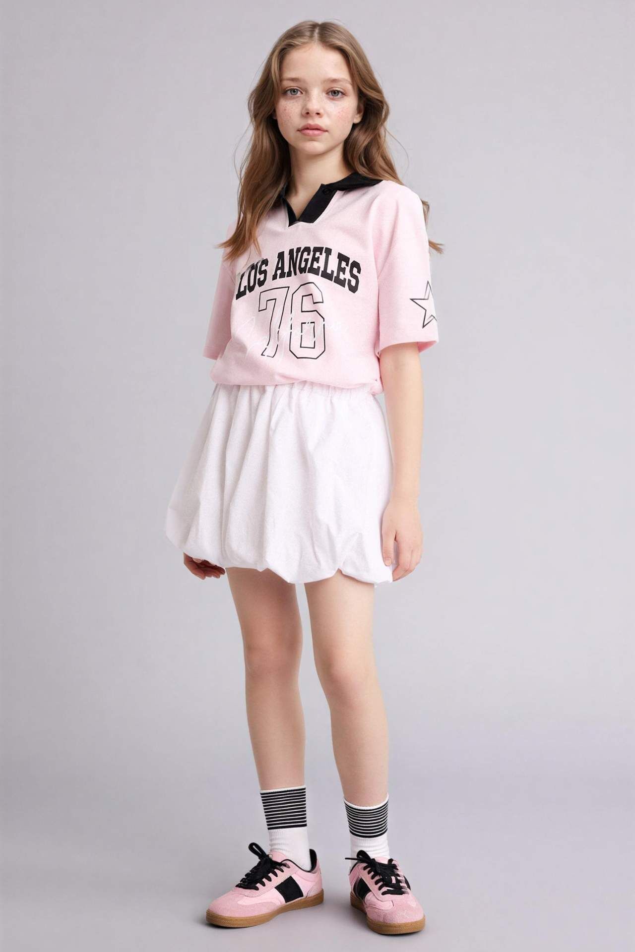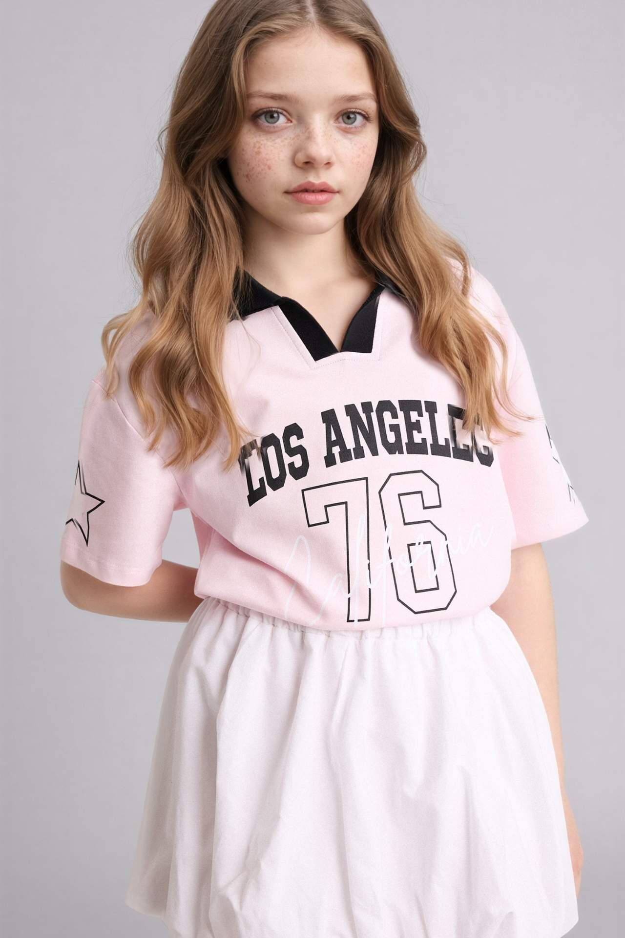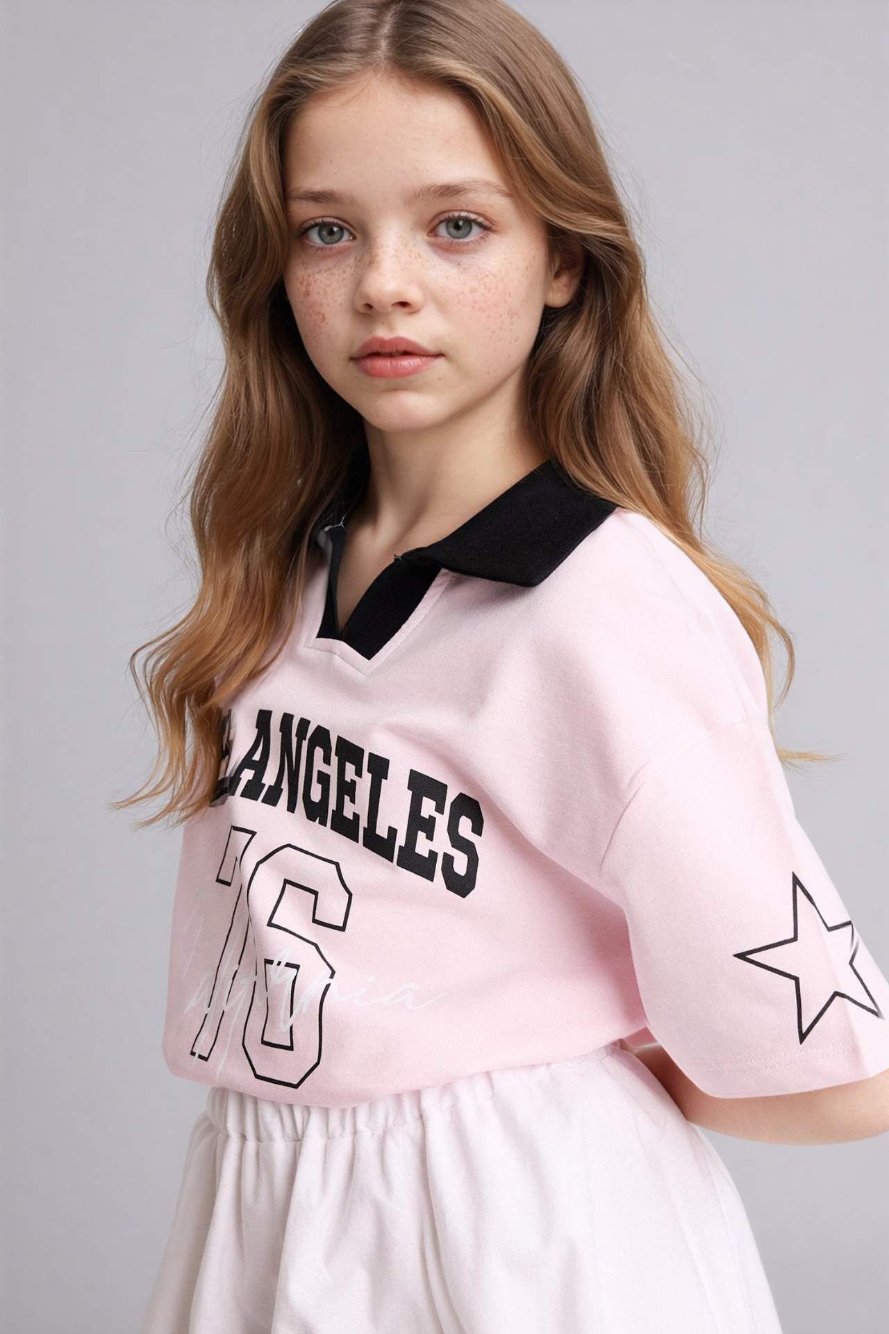 Oversıze Polo Yaka Slogan Baskılı Kısa Kollu Polo Tişört Kız Çocuk