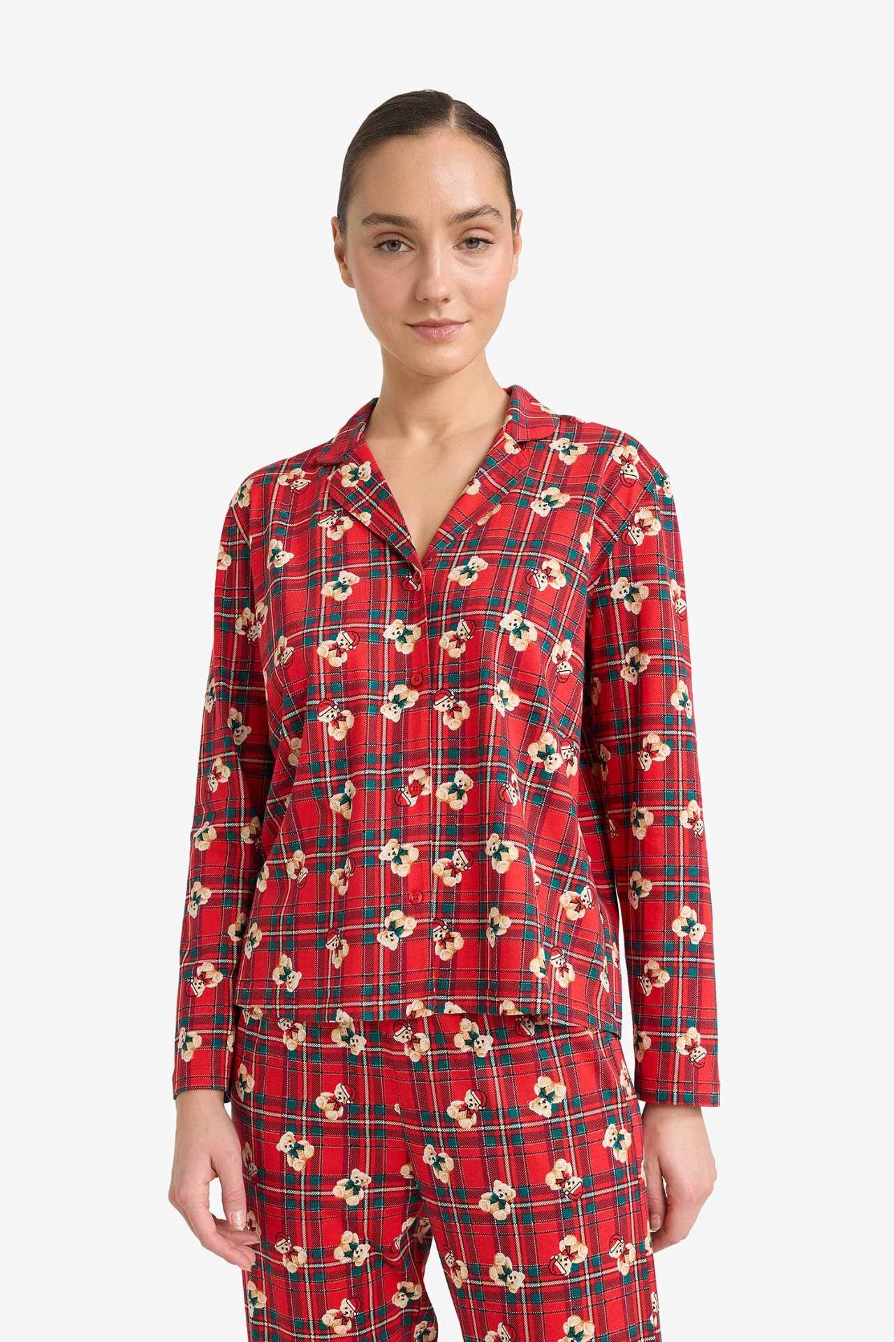 Pijama Takımı Regular Fit Ayıcık Desenli Kareli Uzun Kollu Üst Uzun Alt